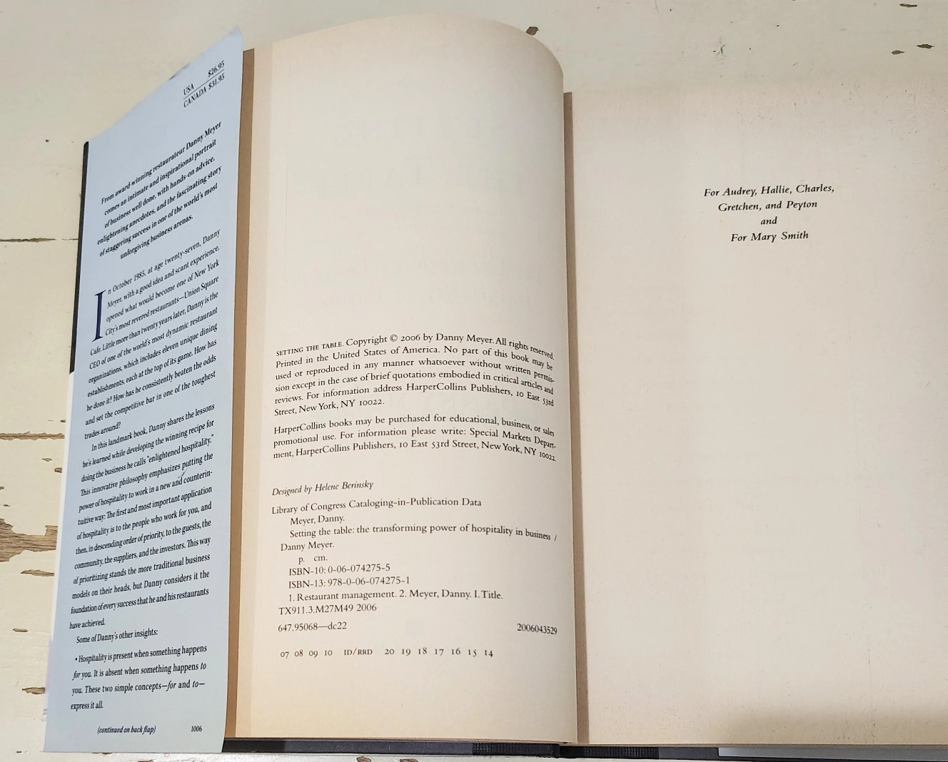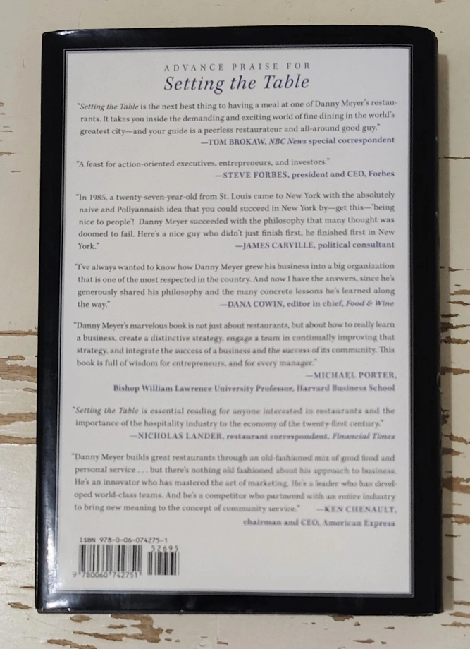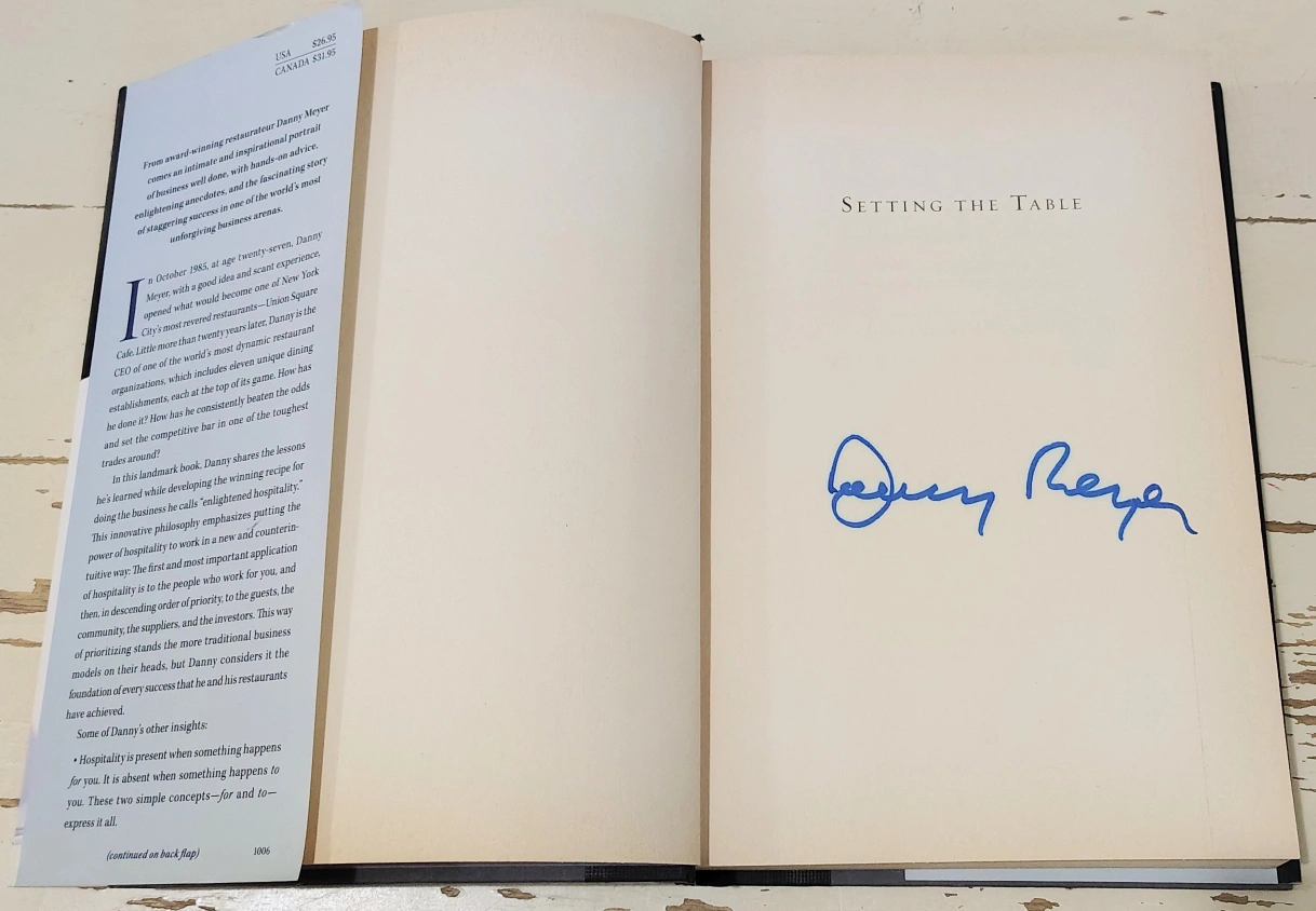 Signed first edition, 2006 "Setting the Table" by Danny Meyer! It is a New York Times Bestseller about the transforming power of hospitality in business. It's a great read for anyone interested in restaurants and the importance of hospitality. Good condition, pages have slight age from the type of paper.