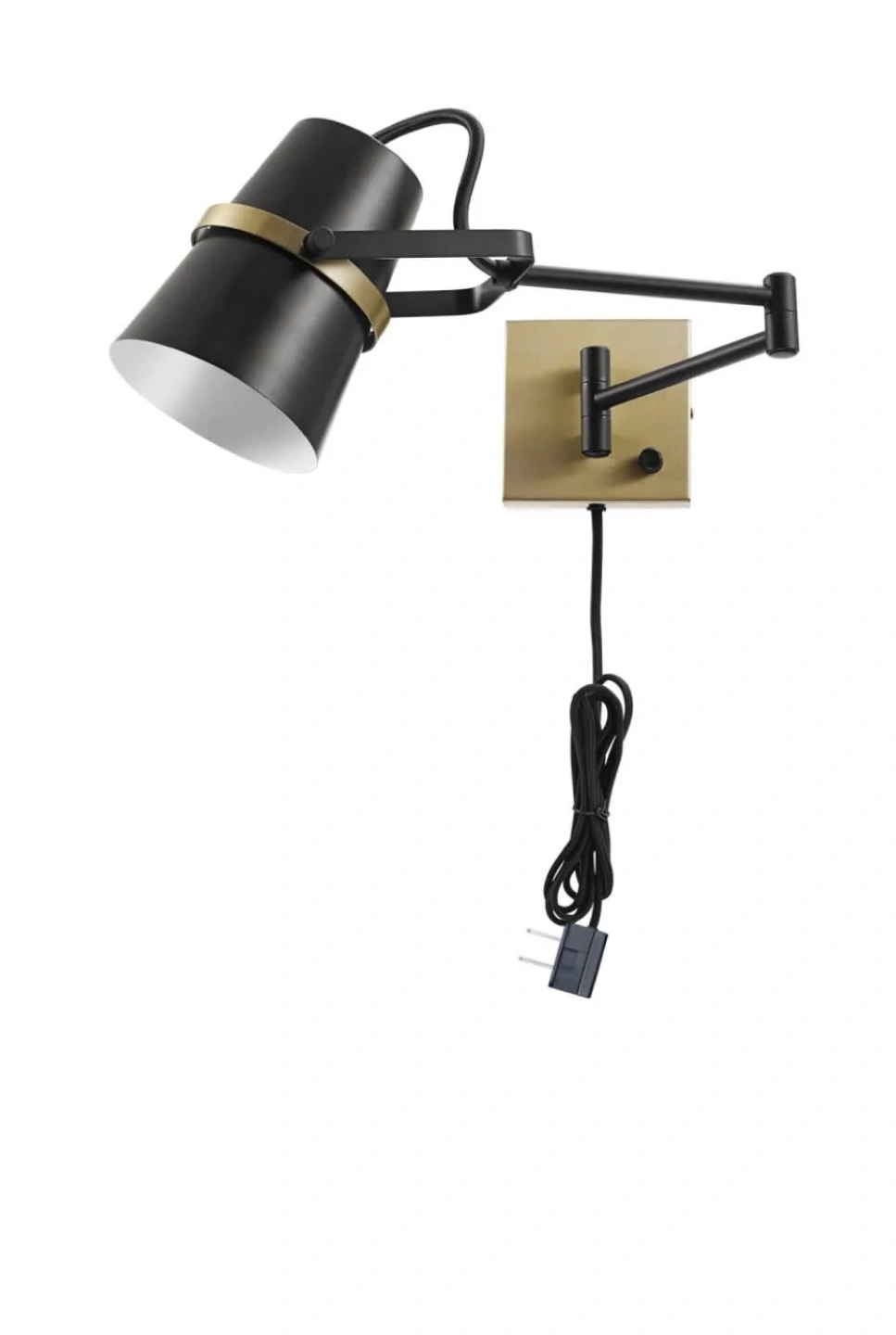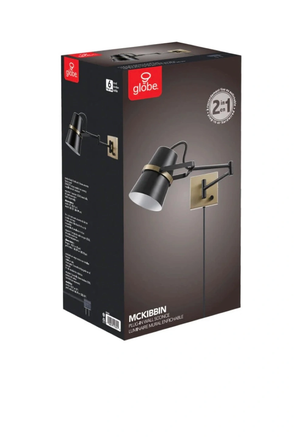 Plug-in or hardwire capability: the innovative 2-in-1 design allows you to install your wall light as a plug-in so you can place it anywhere in your home or use the hardwire option to create a sleek cordless look Fully adjustable lamp head for customized lighting Includes all mounting hardware Constructed of metal Includes a metal shade (1) 60 watt maximum medium (E26) bulb required Fully dimmable with compatible dimmer switch to create the perfect atmosphere (dimmer switch sold separately) Rated for dry locations Dimensions Height: 6-3/8" Width: 5" Extension: 22-1/8" Depth: 4-3/4" Product Weight: 8.76 lbs Shade Height: 6-3/8" Shade Width: 5"