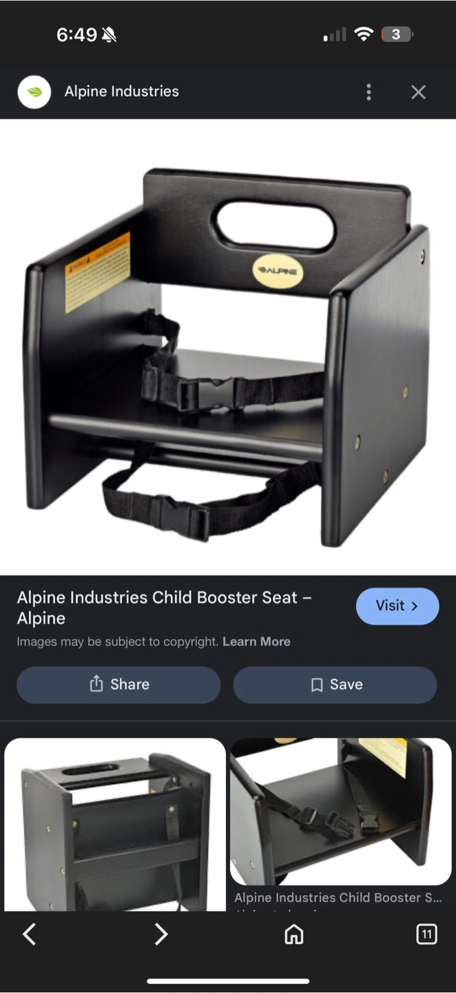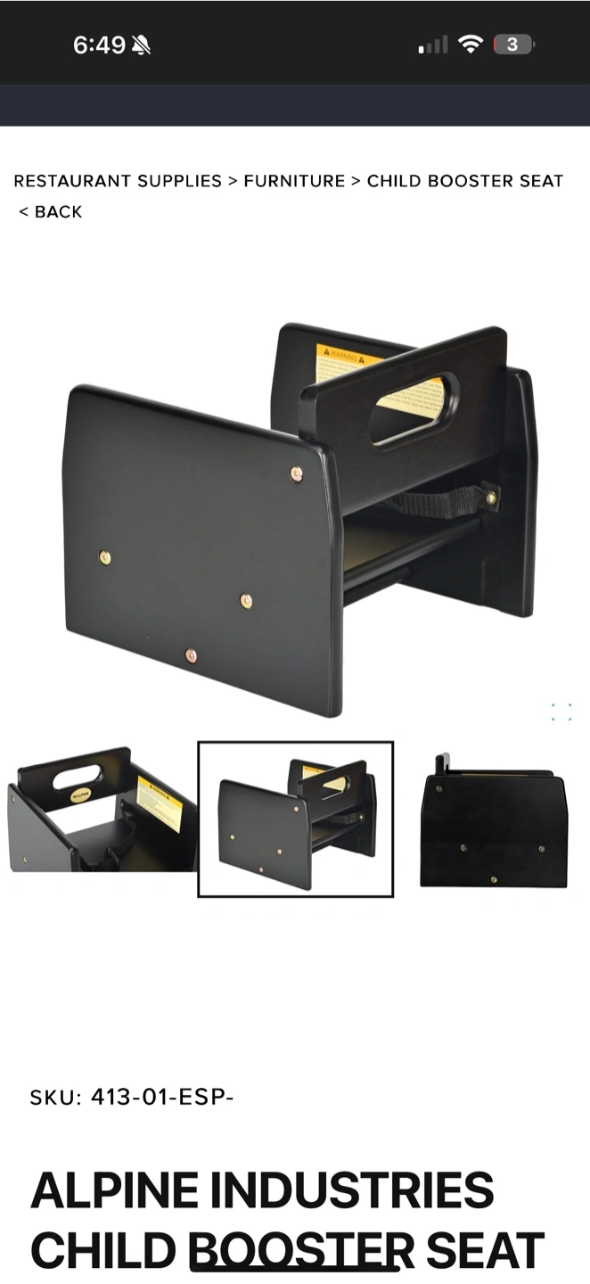 I'm selling an Alpine Industries Child Booster Seat. It's black and in great condition. Perfect for restaurants or home use!