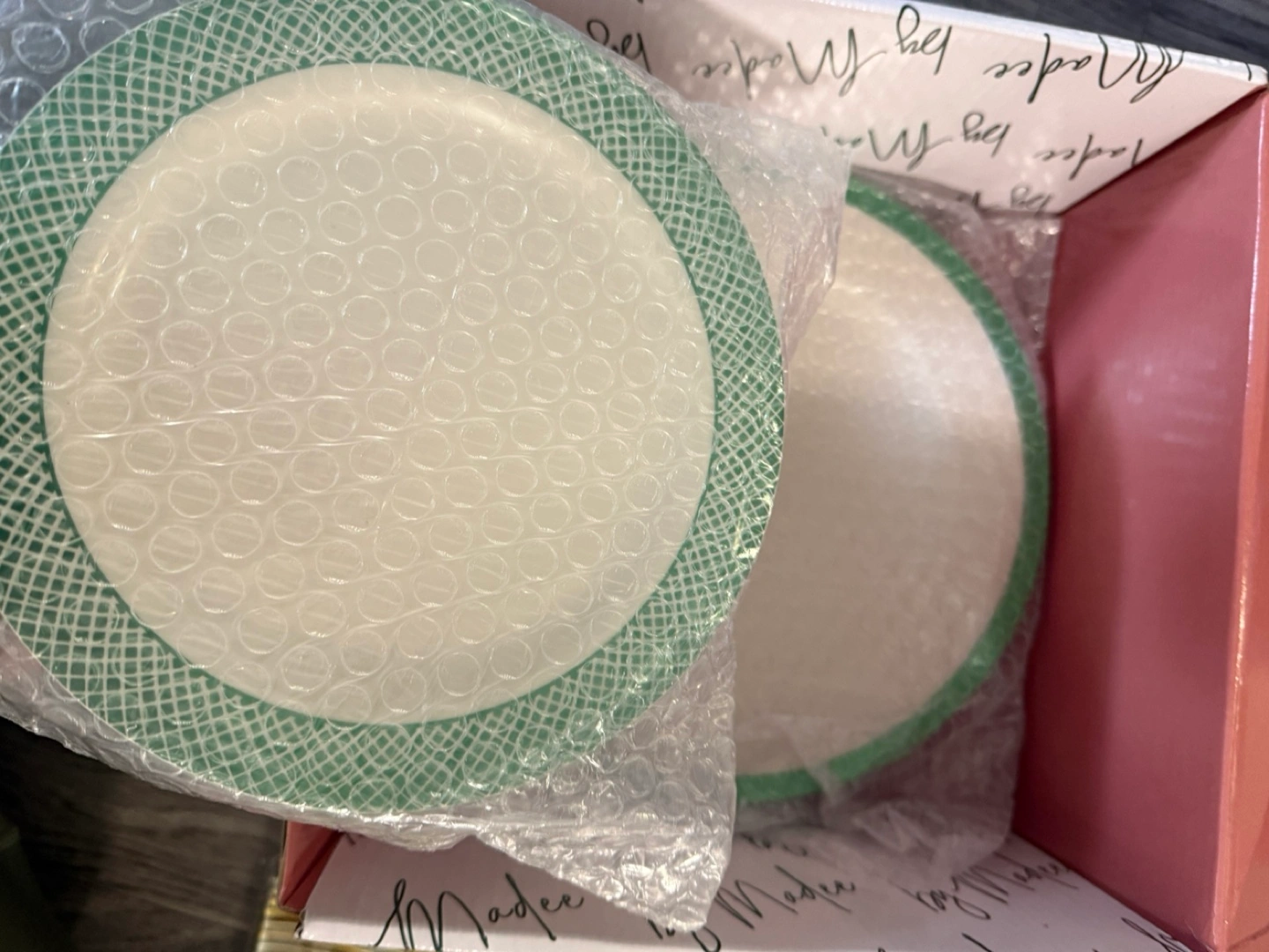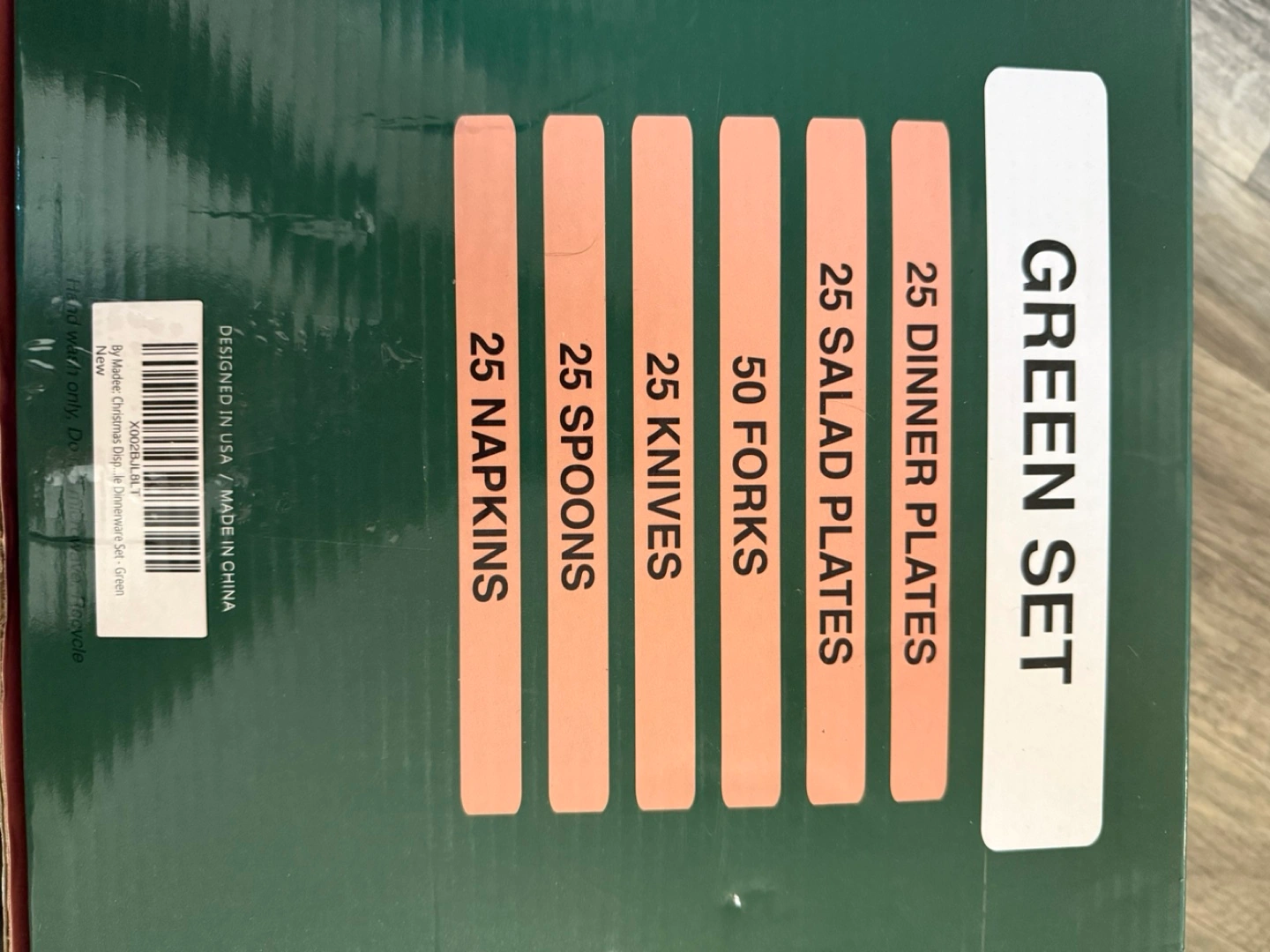 I'm selling a brand new Madee by Madee Green Set! This set includes 25 dinner plates, 25 salad plates, 50 forks, 25 knives, 25 spoons, and 25 napkins
