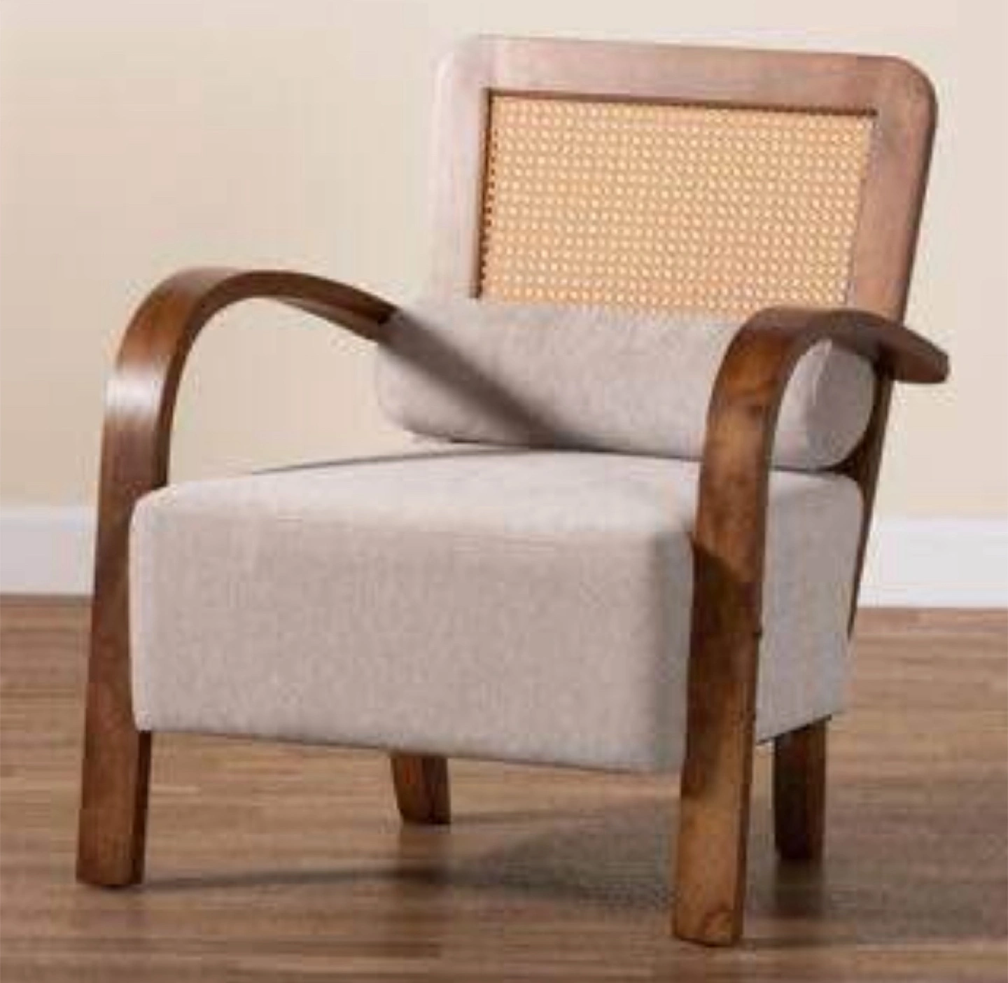 New Japandi Scandinavian Boho Sage Grey and Walnut Brown Armchair Features * New in Excellent Condition! Excellent Reviews!! * Dimensions: 28.10” W x 28.90” D x 32.70” H * Seating: 22.80” W x 24” D x 16” H * Clearance (floor to bottom of seat): 6.70” H * Padded with foam and upholstered in fabric * Woven synthetic rattan embellishments * Includes 1-removable pillow for lower back support * Trusted Seller / Read/ See My Reviews! Follow Me For Amazing Deals Listed Daily