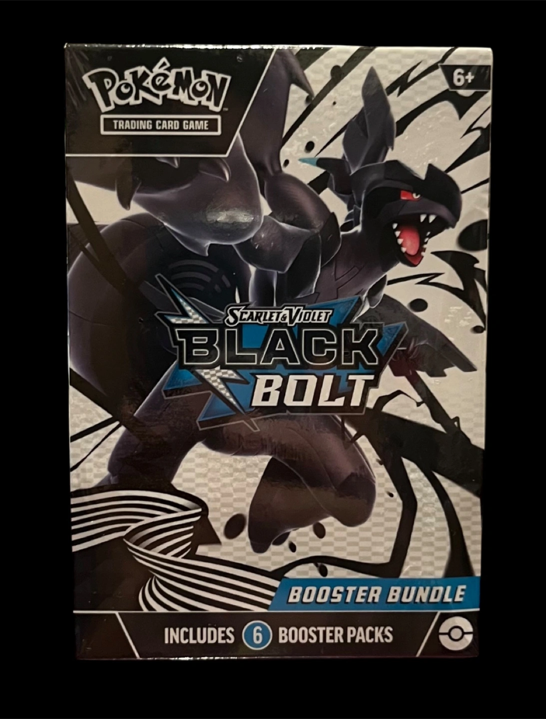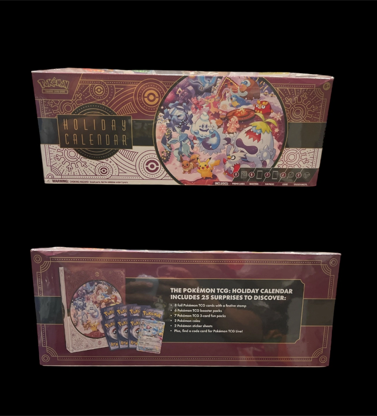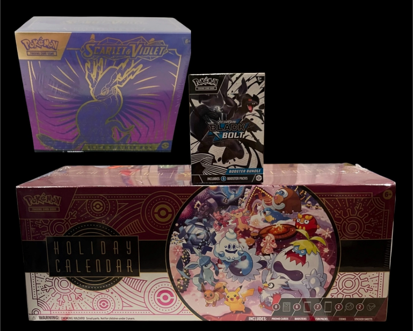Selling a Pokemon Trading Card Game bundle. Includes Scarlet & Violet Black Bolt Booster Bundle (6 booster packs), Scarlet & Violet Elite Trainer Box, and Holiday Calendar