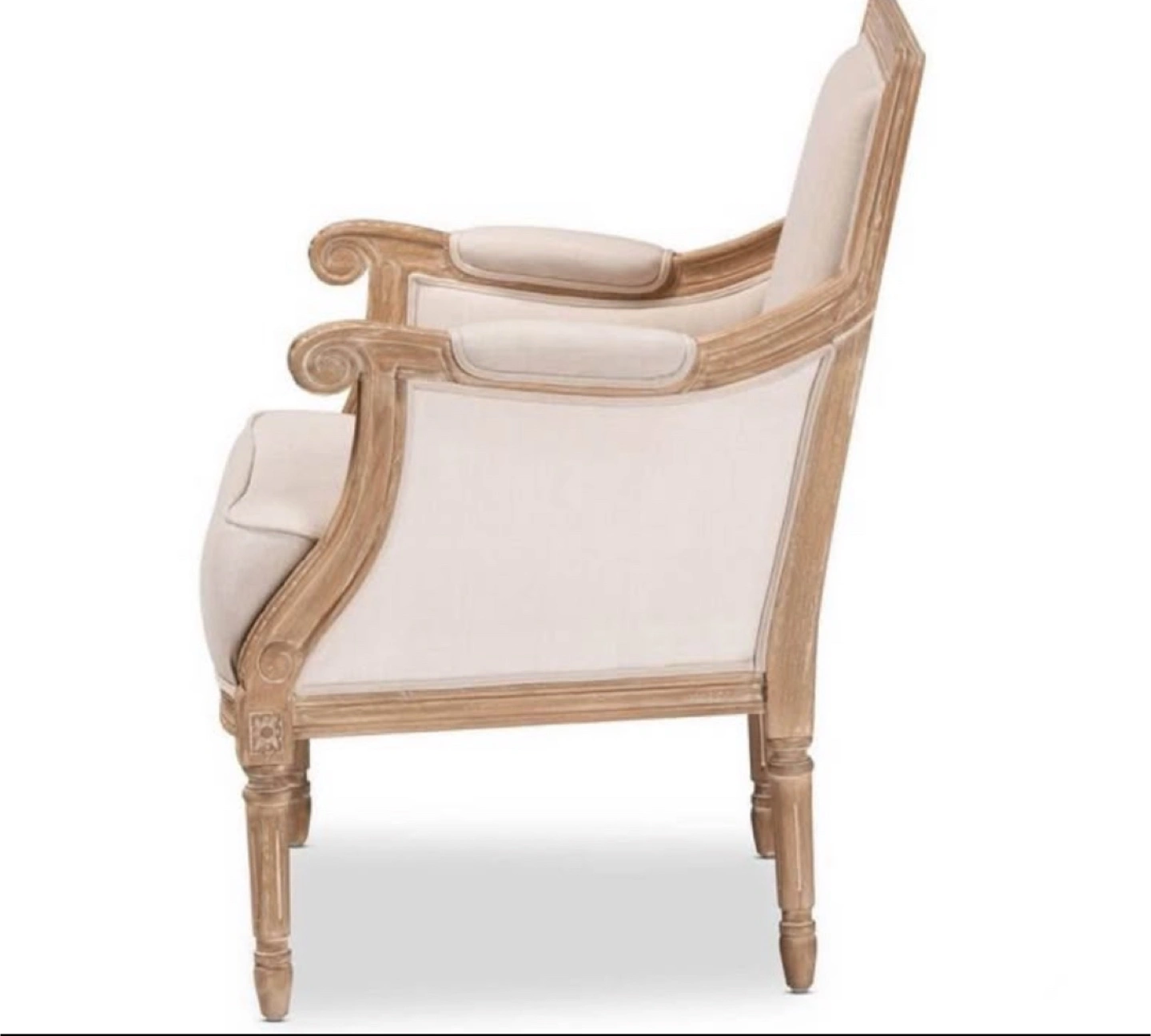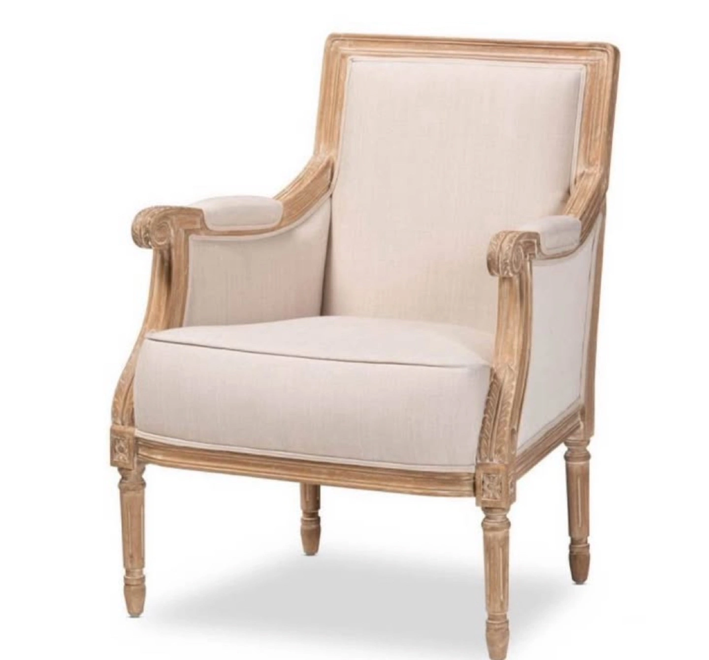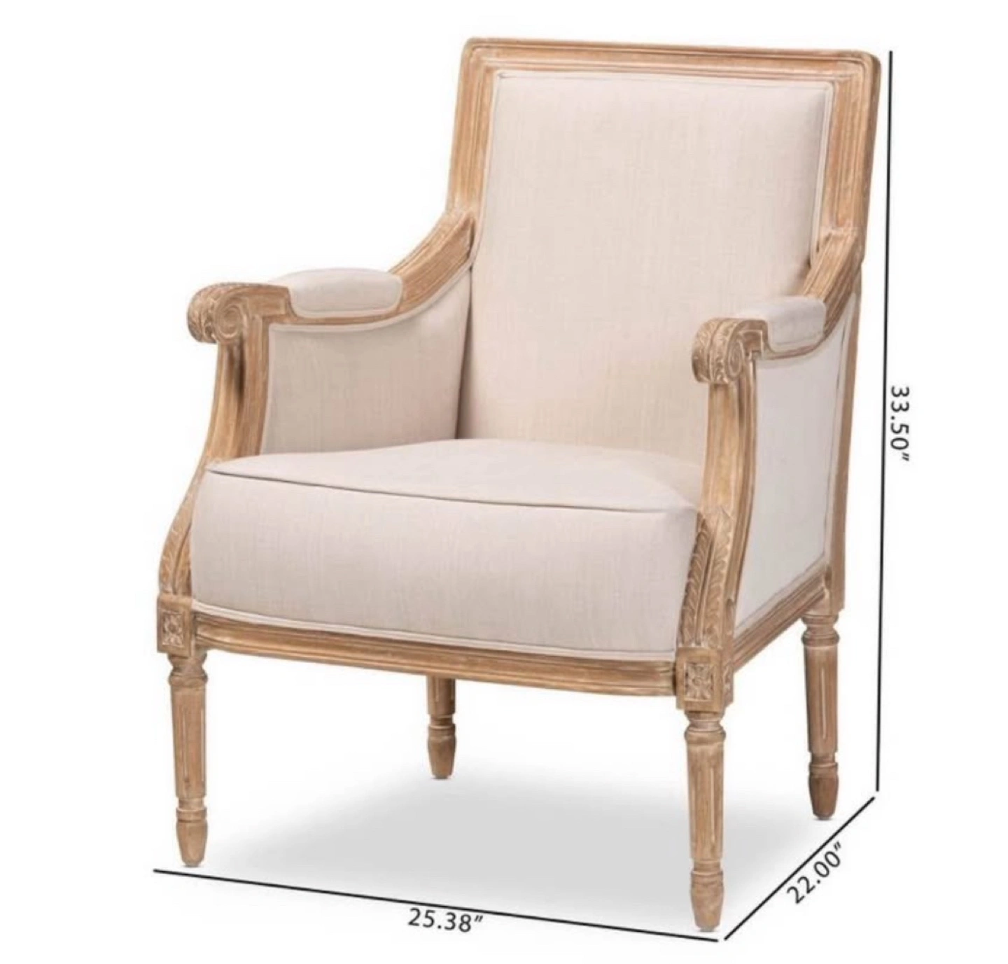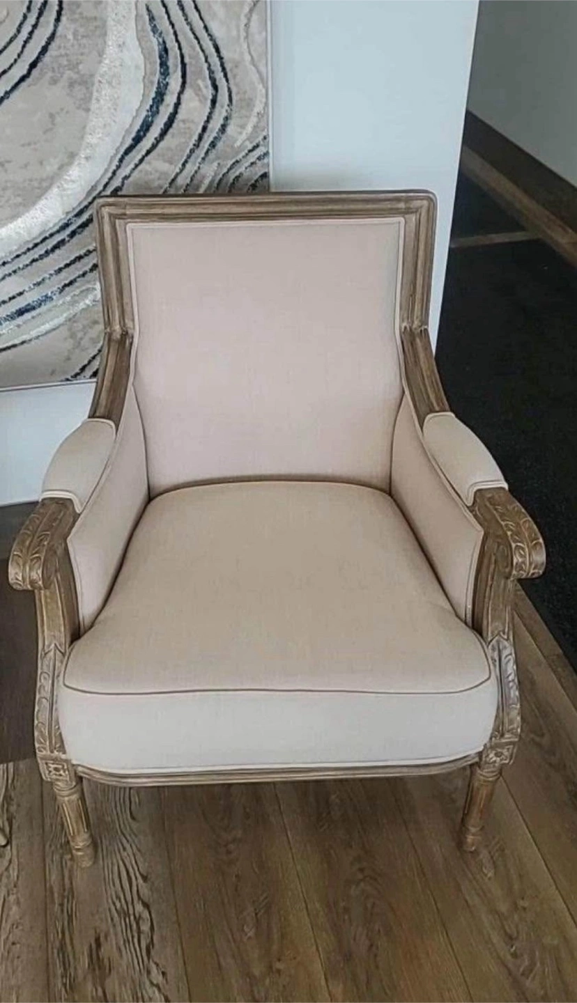 New French Accent Arm Chair * Dimensions: 33.50" H x 25.38" W x 22.00" L * Seat dimensions: 17.75" H x 22.00" W x 18.75" L * Traditional French accent chair * Versatile light beige cotton upholstery * Mindi wood frame with distressed natural finish including white streaking * Polyurethane foam cushions * Trusted Seller / Read/ See My Reviews! Follow Me For Amazing Deals Listed Daily!
