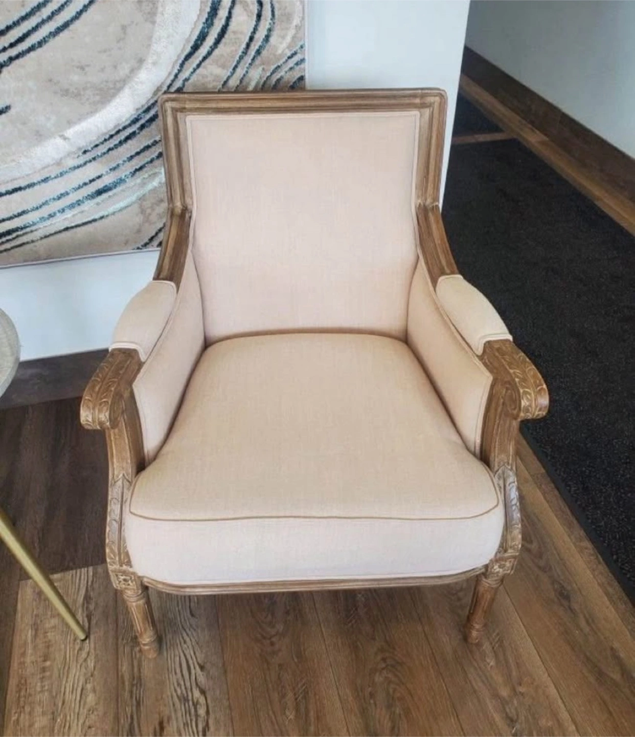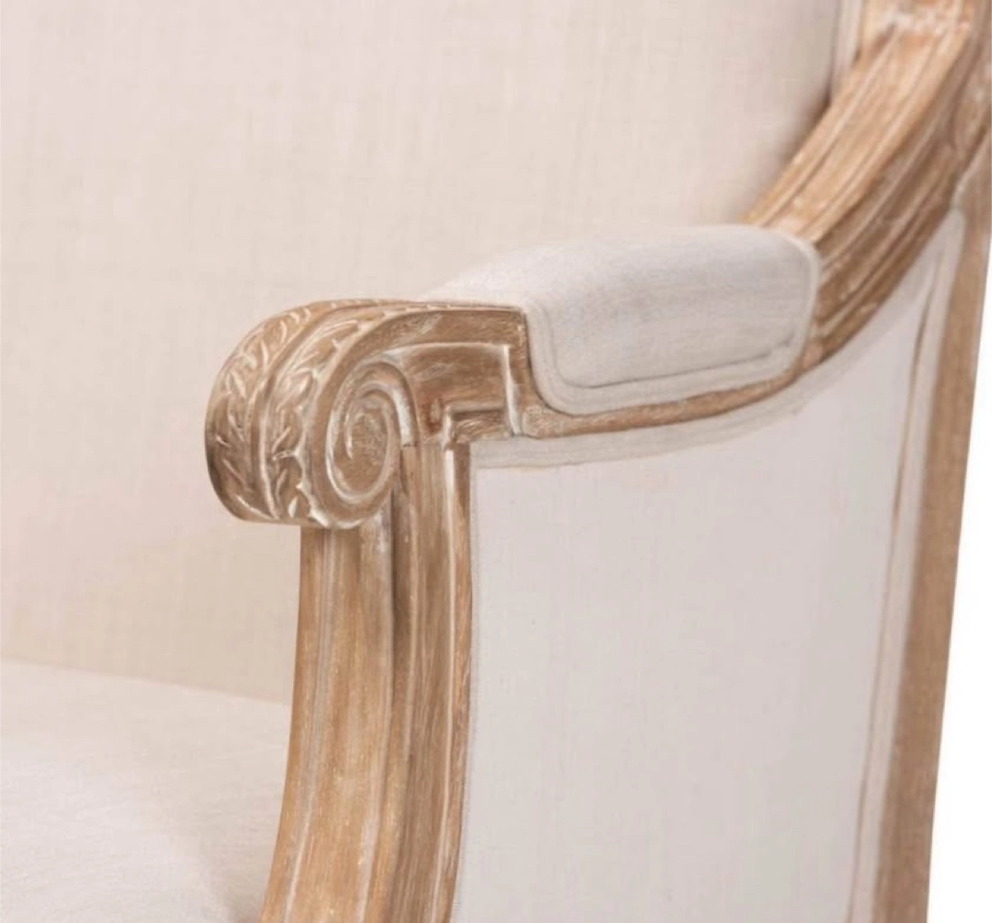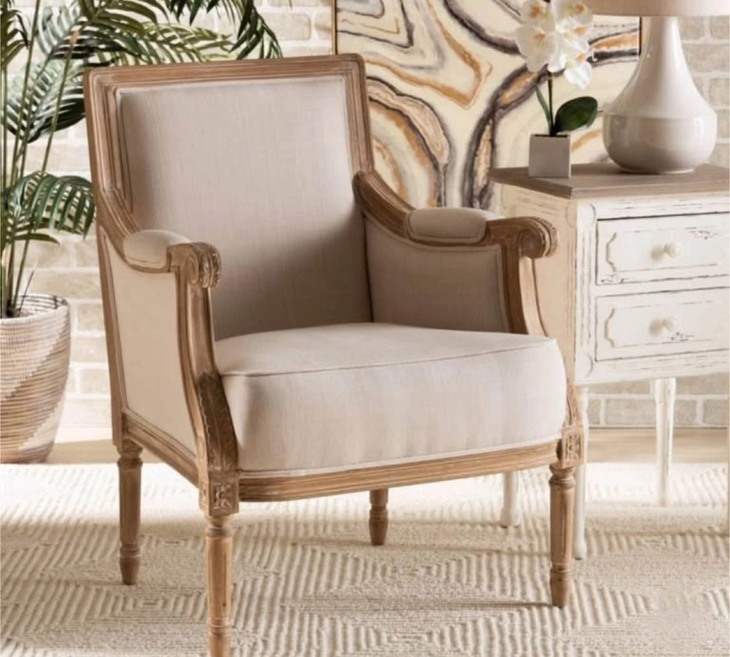 New French Accent Arm Chair * Dimensions: 33.50" H x 25.38" W x 22.00" L * Seat dimensions: 17.75" H x 22.00" W x 18.75" L * Traditional French accent chair * Versatile light beige cotton upholstery * Mindi wood frame with distressed natural finish including white streaking * Polyurethane foam cushions * Trusted Seller / Read/ See My Reviews! Follow Me For Amazing Deals Listed Daily!