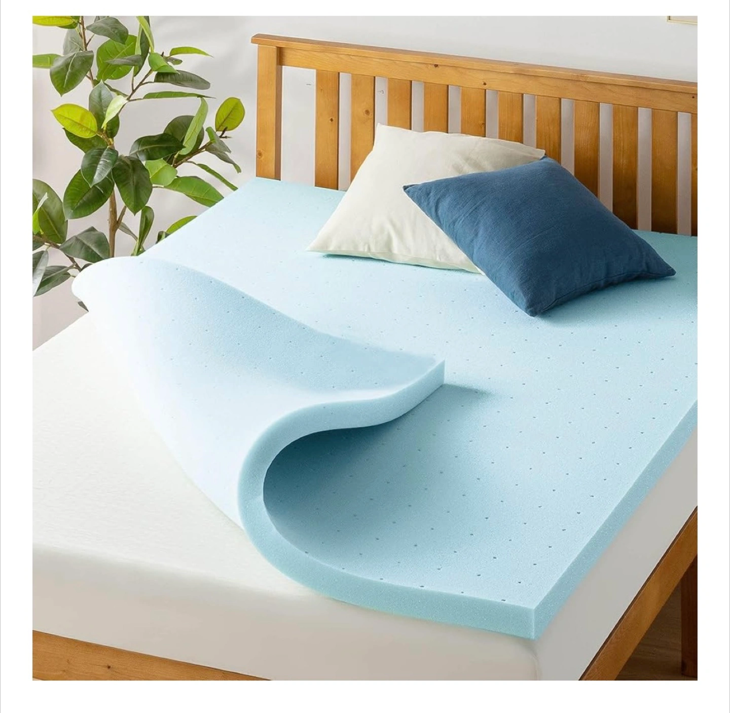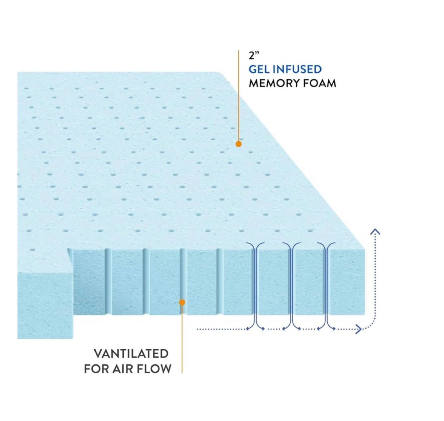 This is a 2" gel infused memory foam mattress topper. It's designed to be ventilated for airflow, so you can sleep comfortably. It's in great condition and ready to help you get a better night's sleep