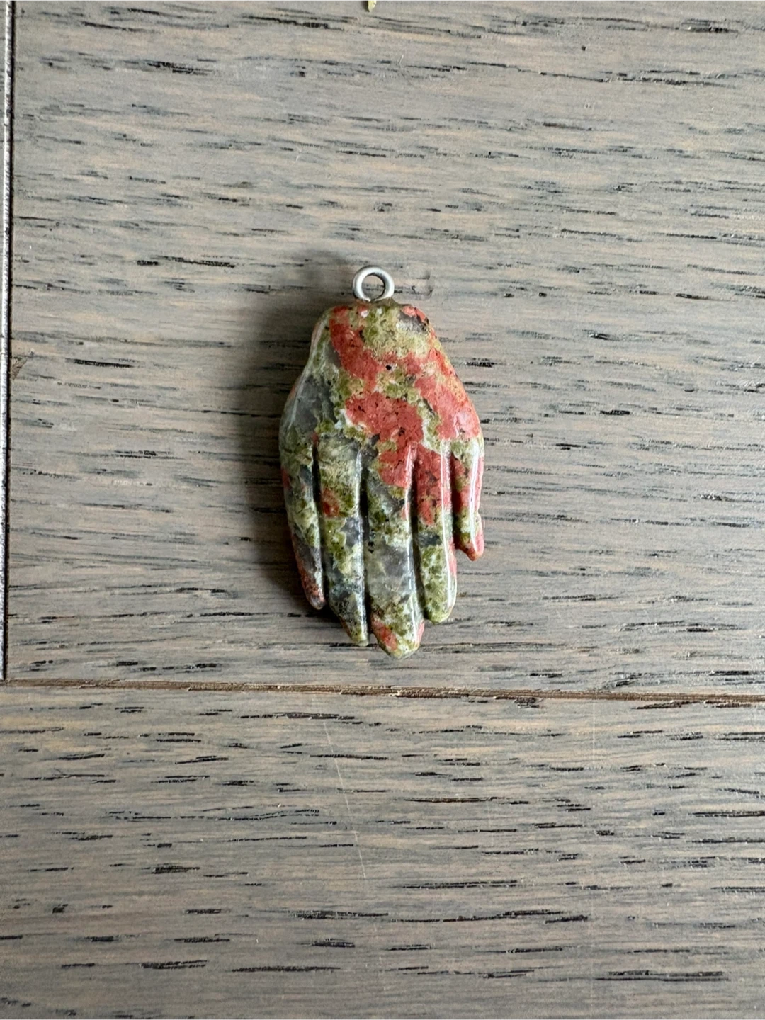 Unique hand-shaped pendant made from a beautiful stone with a mix of green and red hues! It's perfect for adding a touch of natural charm to any outfit. The pendant has a silver-tone bail ready to be added to your favorite necklace or chain