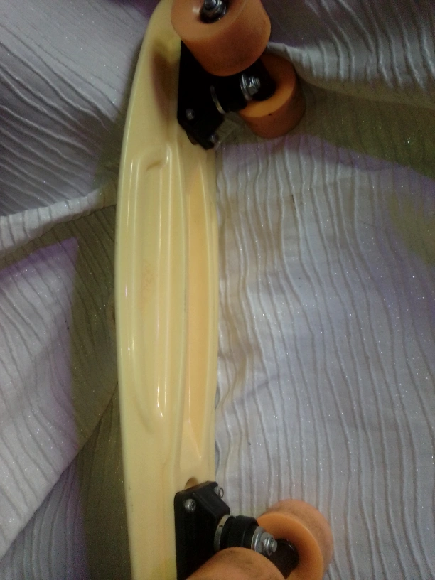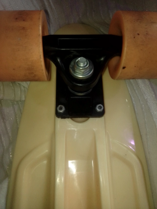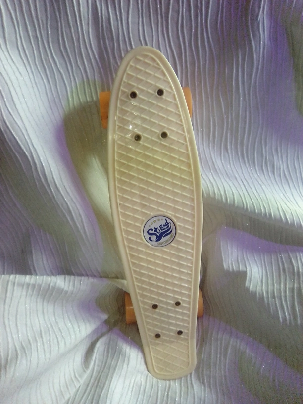 Selling a Sk8board skateboard. It has a cream-colored deck and orange wheels. Great for cruising around!