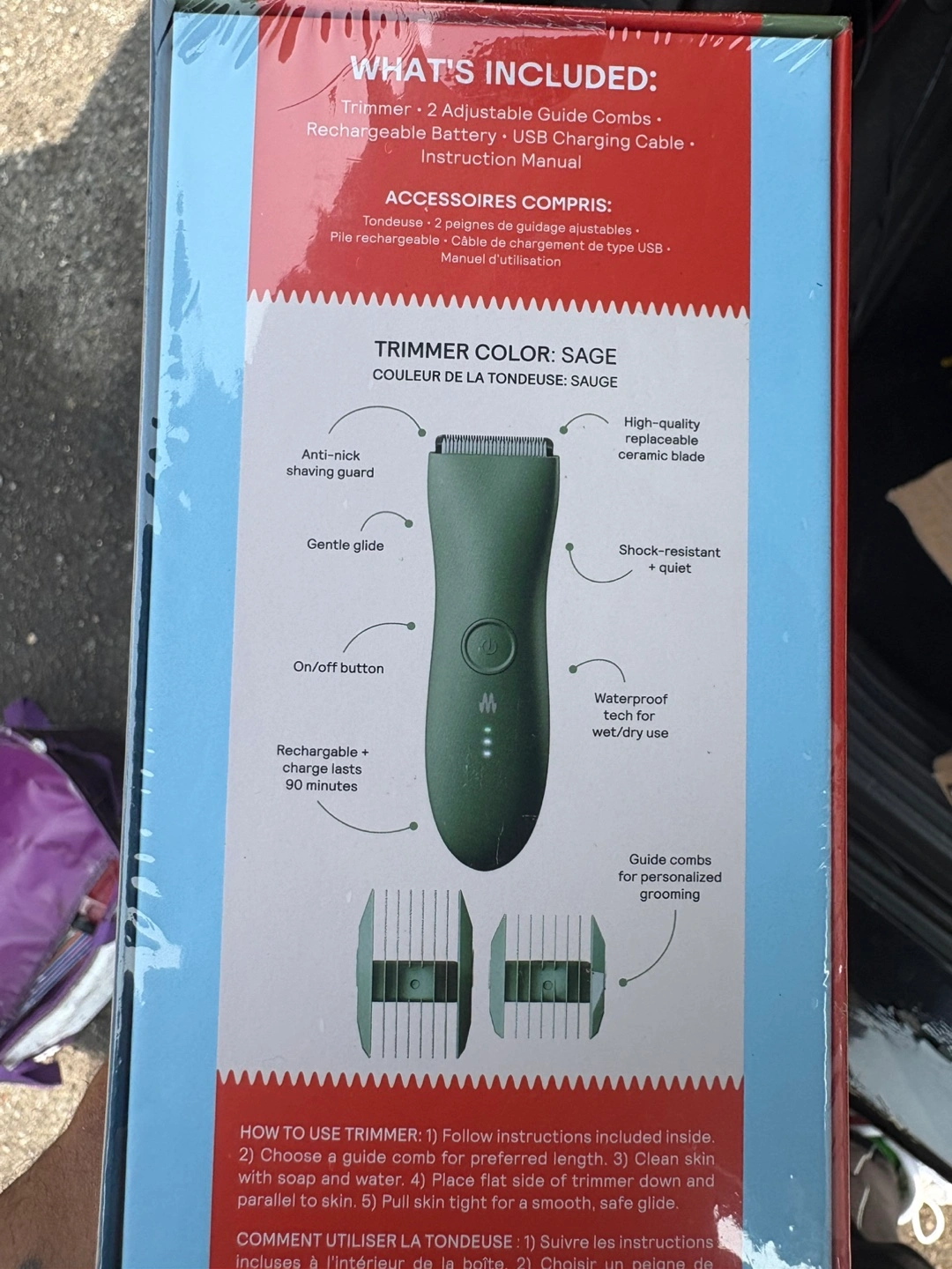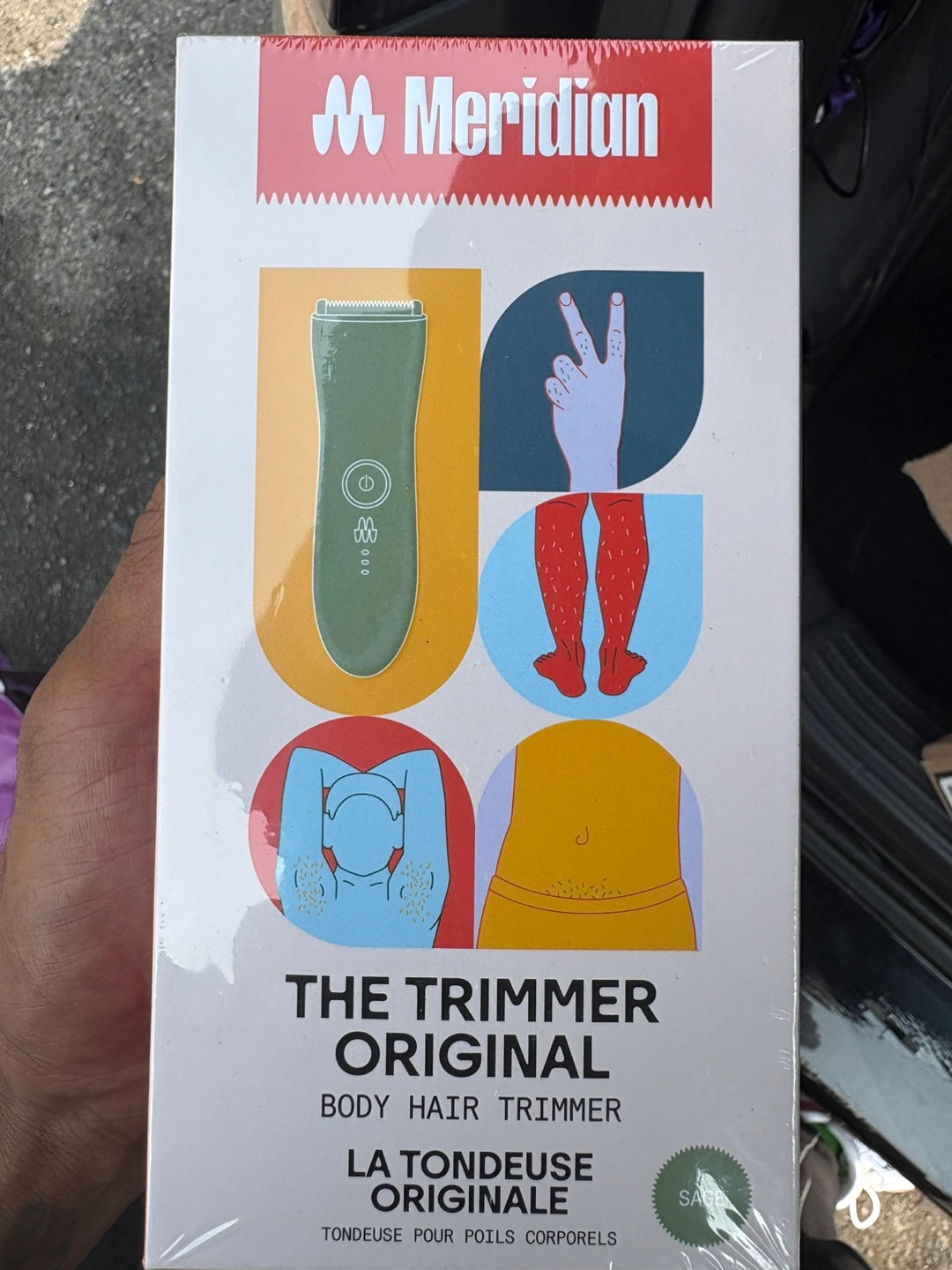 Selling a Meridian The Trimmer Original body hair trimmer in sage color. It's brand new and comes with the box! What's included: - Trimmer - 2 Adjustable Guide Combs - Rechargeable Battery - USB Charging Cable - Instruction Manual It features an anti-nick shaving guard, gentle glide, and a high-quality replaceable ceramic blade. It's also waterproof for wet/dry use and rechargeable, lasting 90 minutes per charge