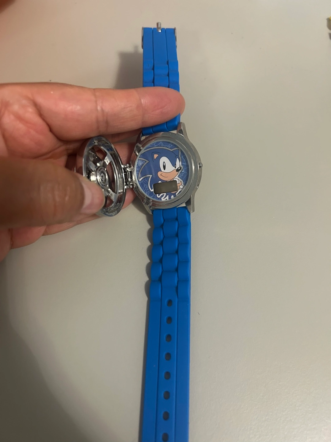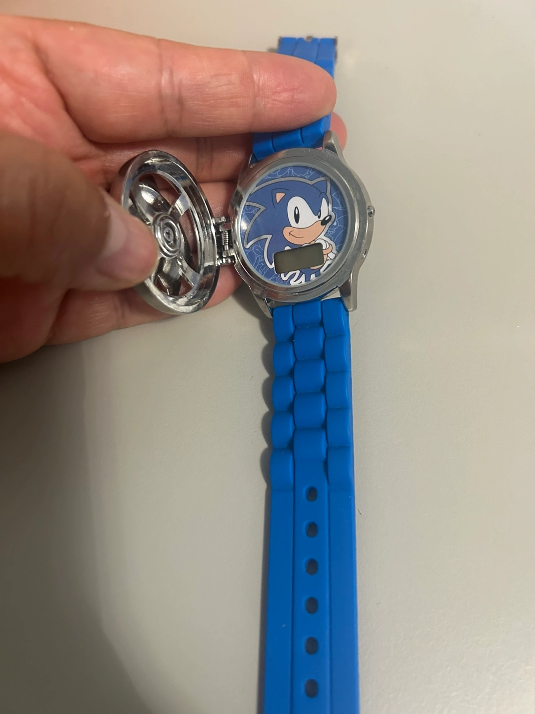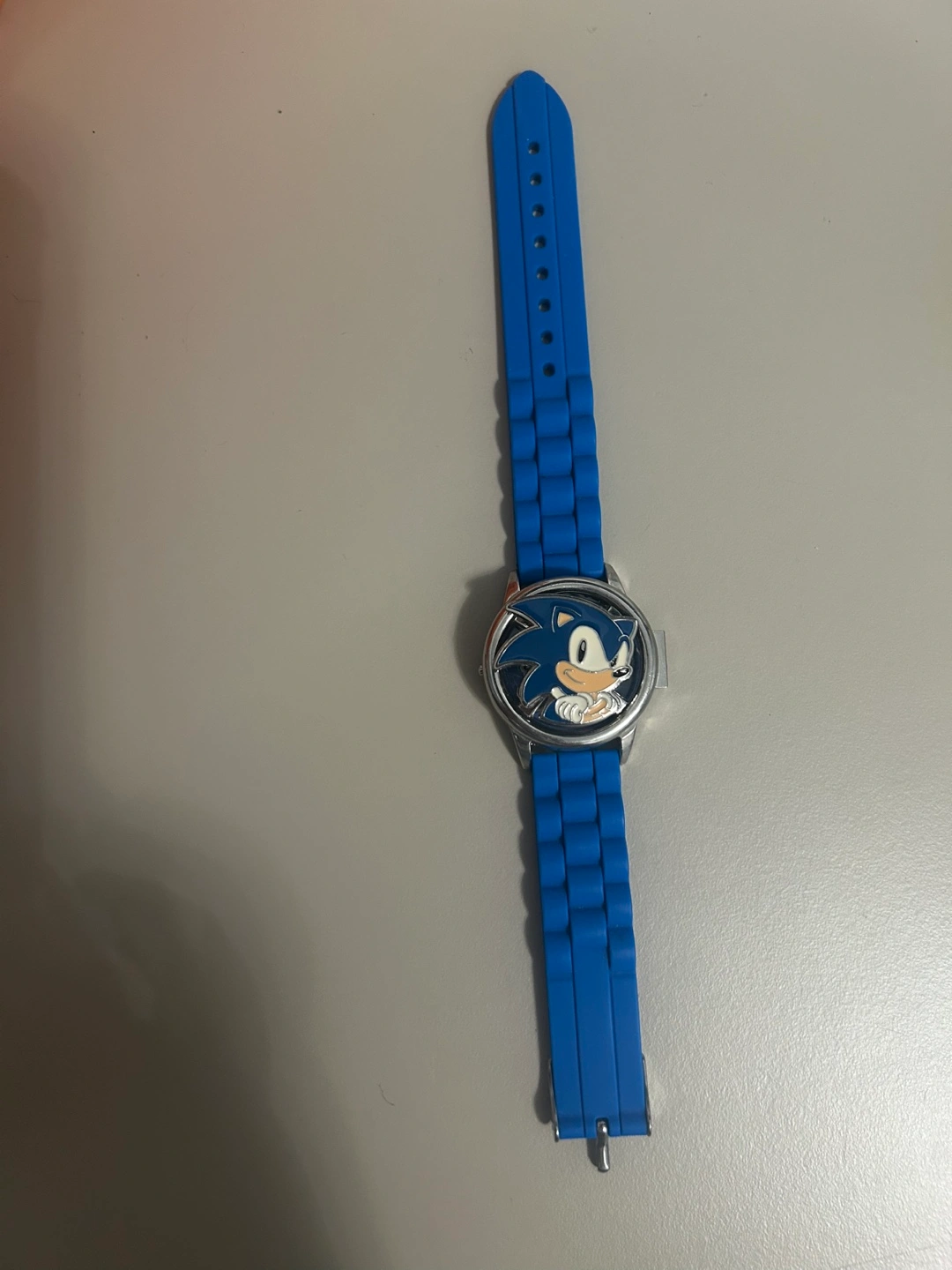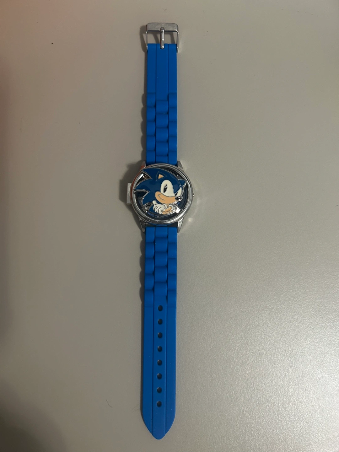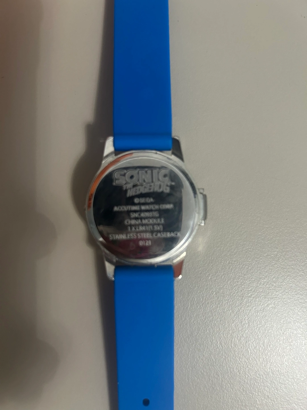 Selling a Sonic the Hedgehog watch! It's blue and features Sonic on the face. The watch has a stainless steel caseback. It requires batteries 1 X LR41(1.5V)