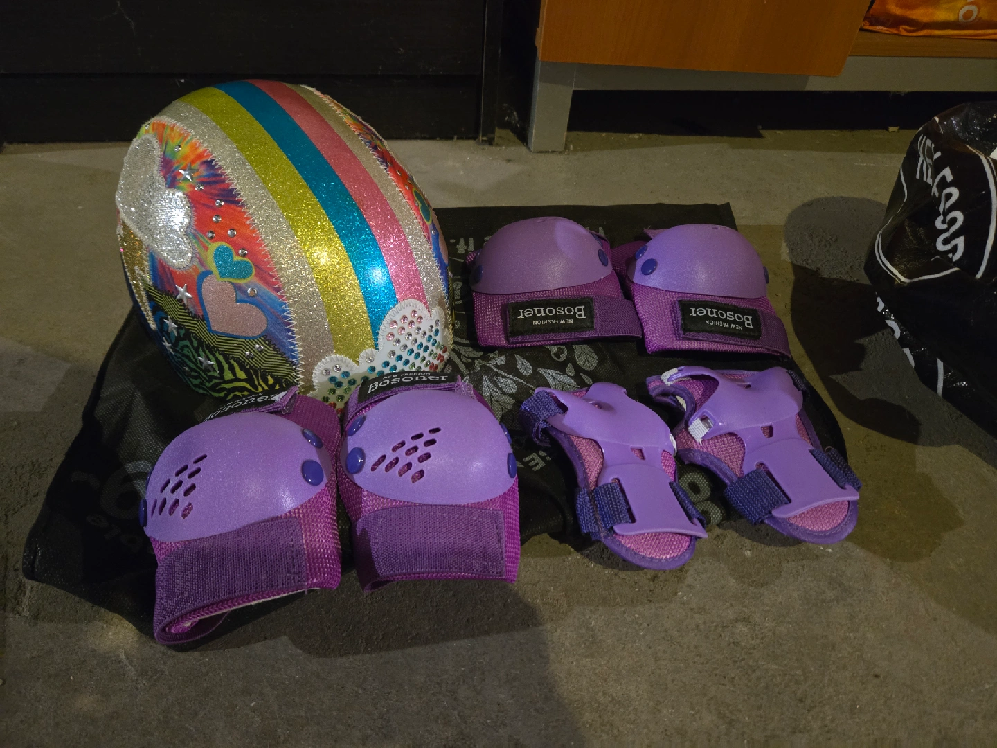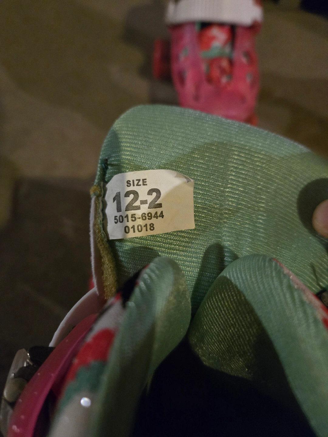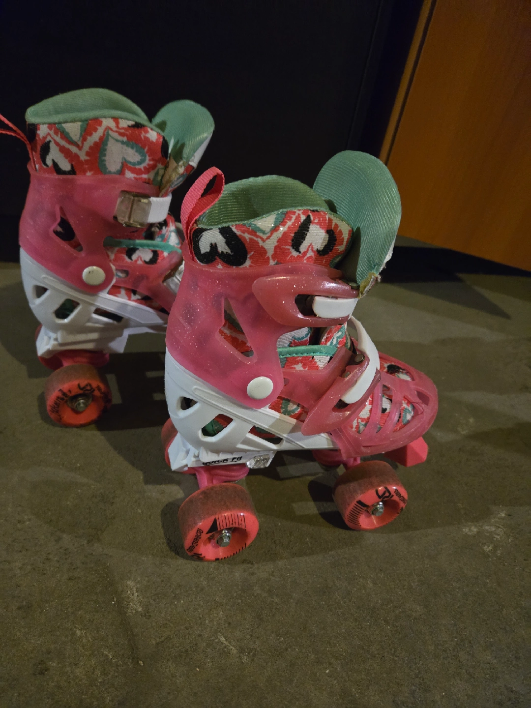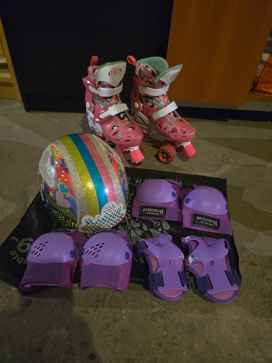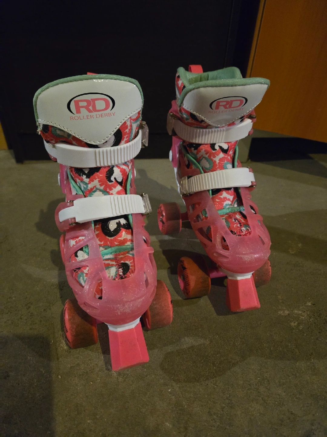 Girl's Roller Derby roller skates, size 12-2. Comes with a helmet, knee and elbow pads