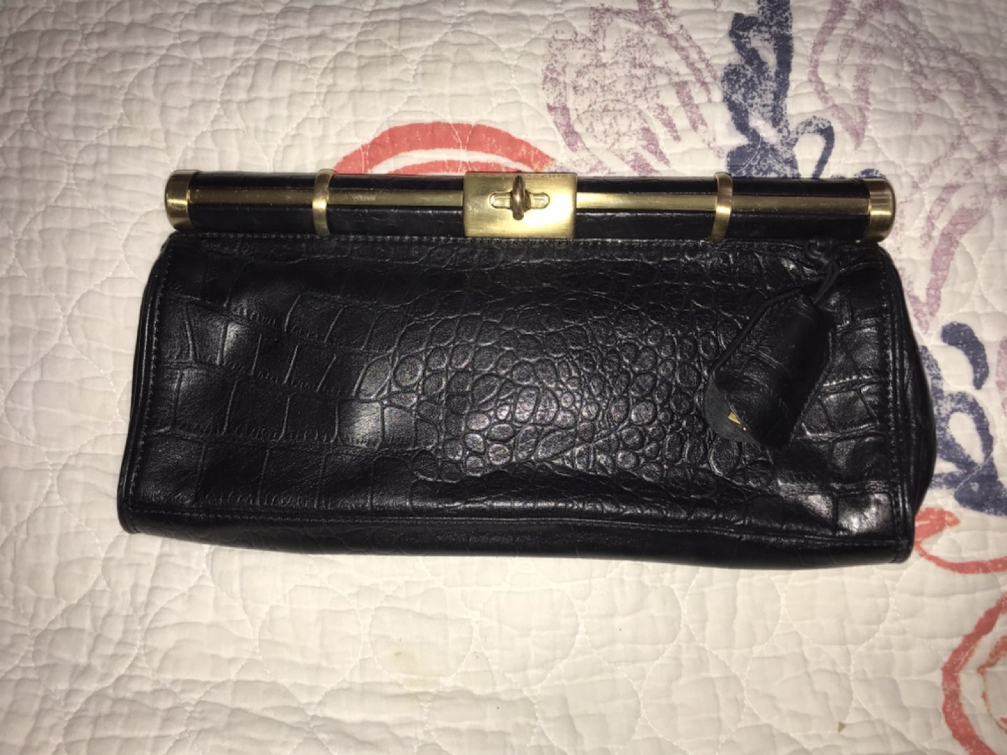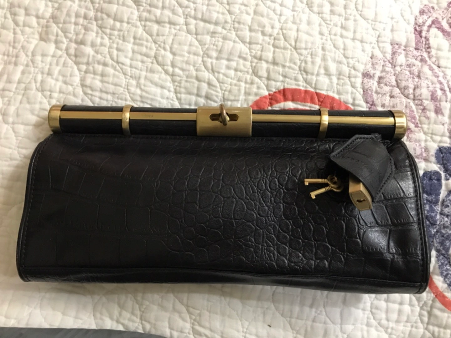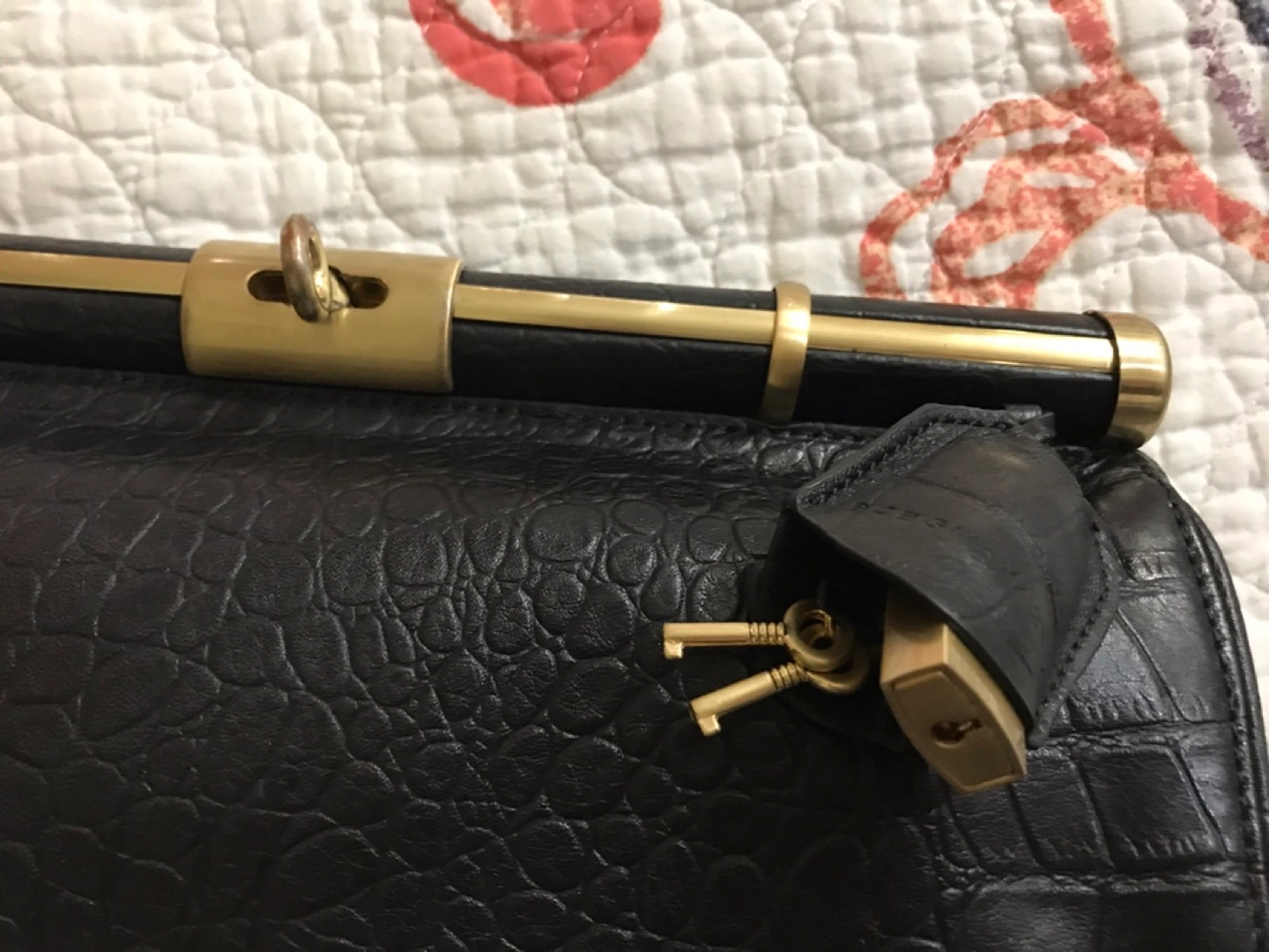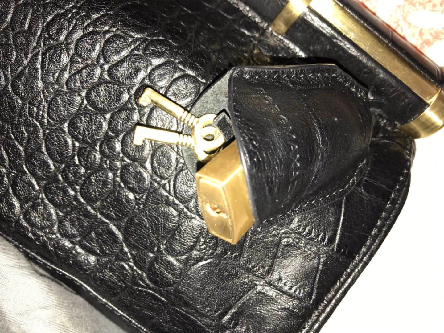 Natural embossed leather. Leather part is in perfect condition, metal parts a bit scratched. Lightly used)