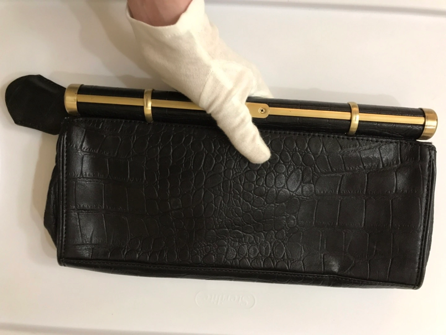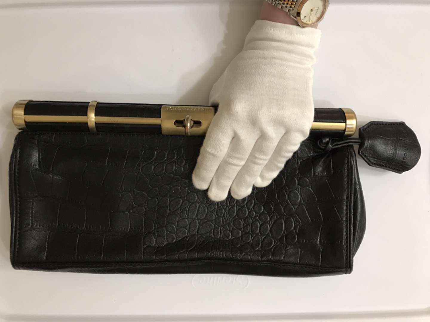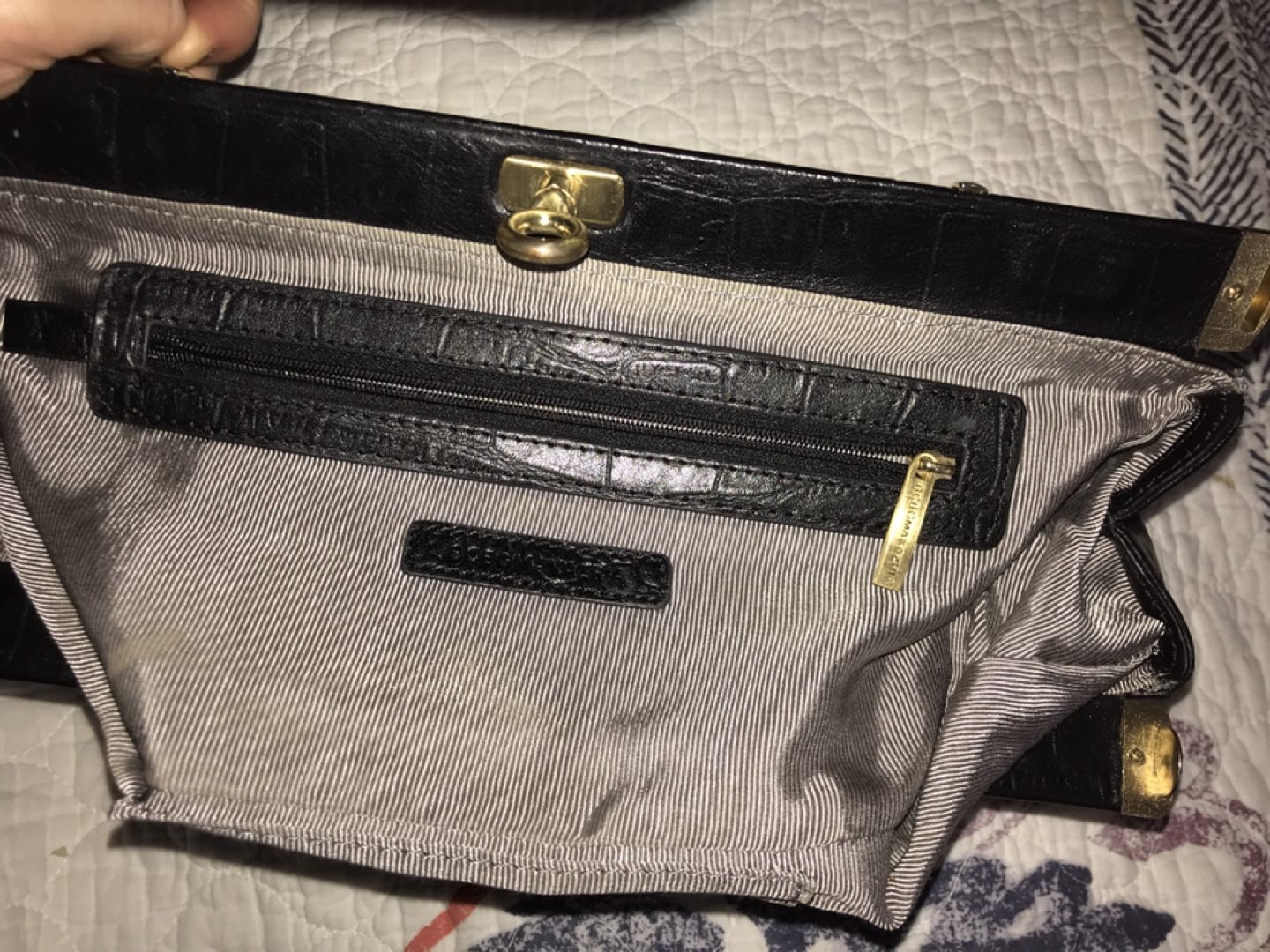 Natural embossed leather. Leather part is in perfect condition, metal parts a bit scratched. Lightly used)