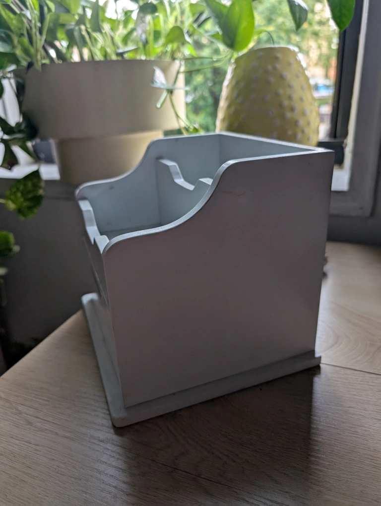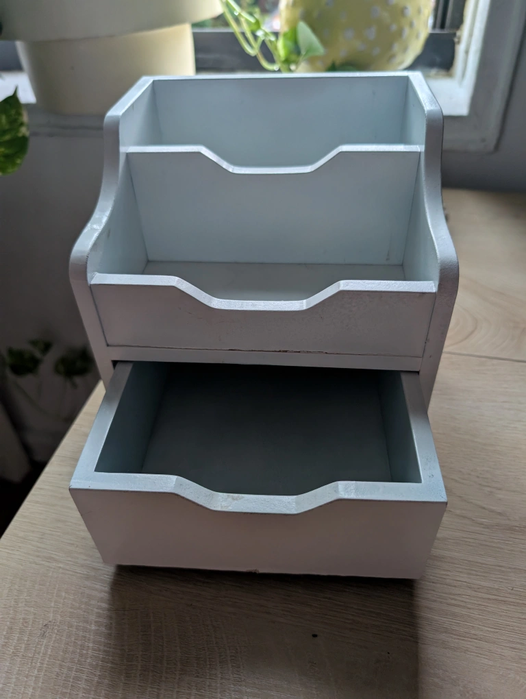 A cute white wooden desk organizer. It has two tiers for holding cosmetics or stationary.
