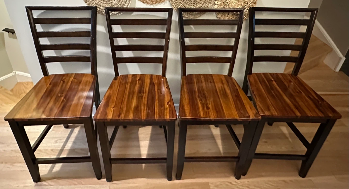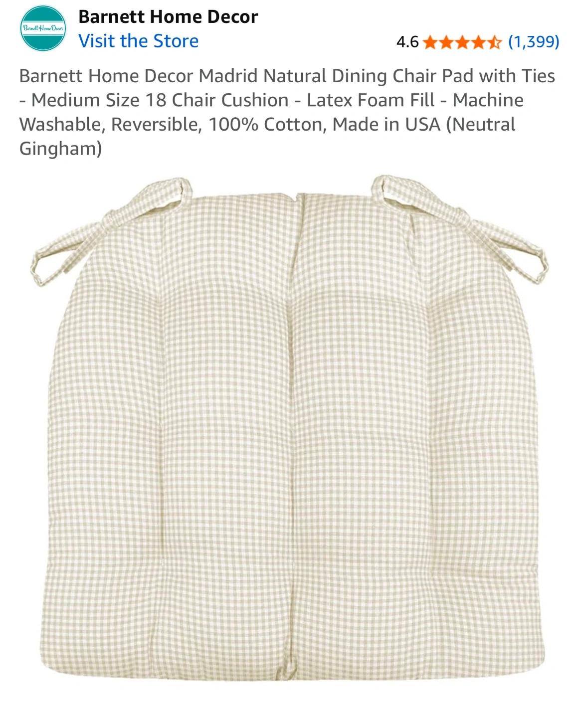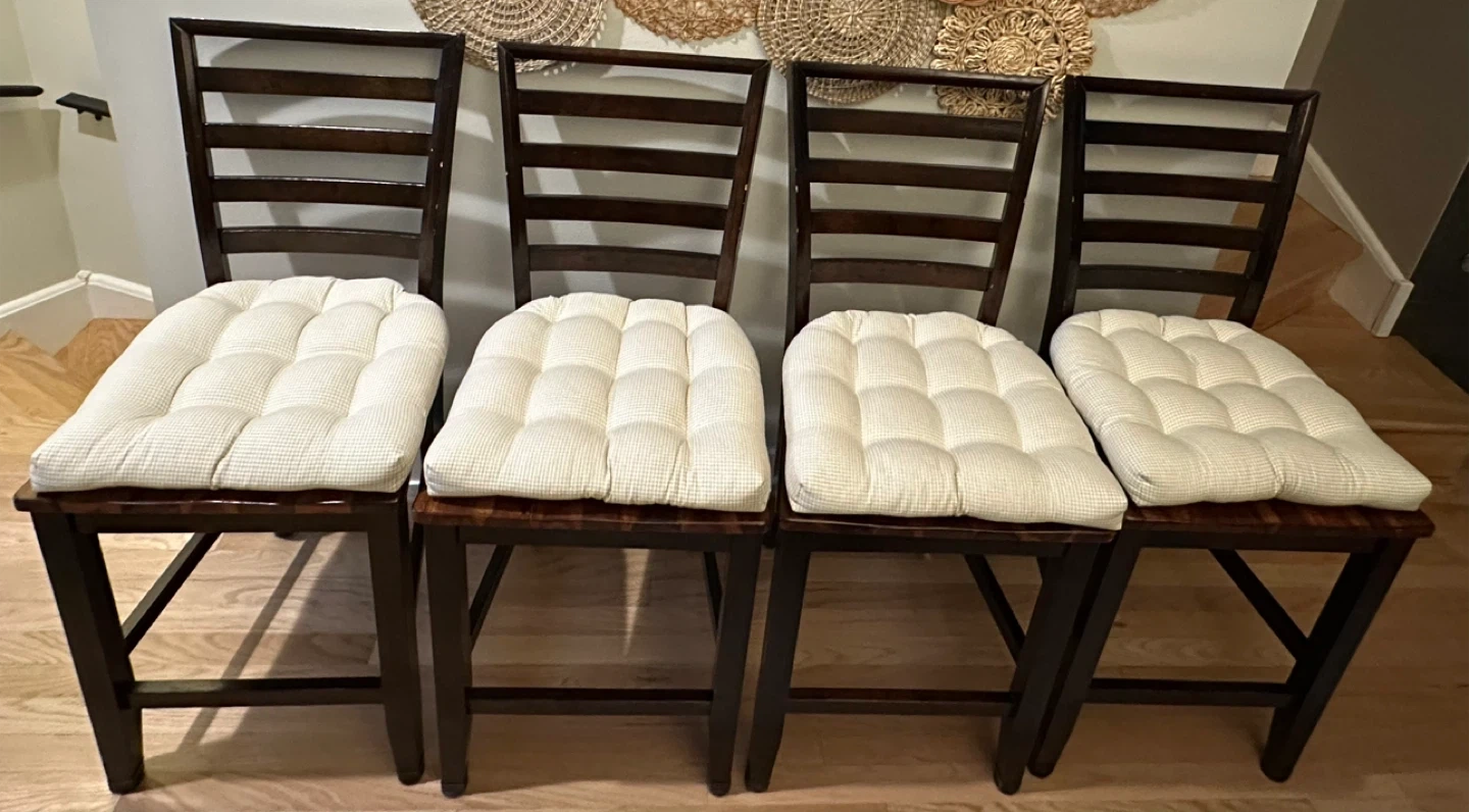 Selling a set of four chair pads from Barnett Home Decor ($39/piece) from Amazon. They're the Madrid Natural Dining Chair Pad with Ties, in a medium size (18"). They feature a latex foam fill and are made from 100% cotton with a neutral gingham pattern. They're also machine washable! The chairs are a set of 4 two tone wood, chair height is 24”. If you want just the 4 chairs they are $25/each. If you want the cushions with the chairs, they are $40/each.