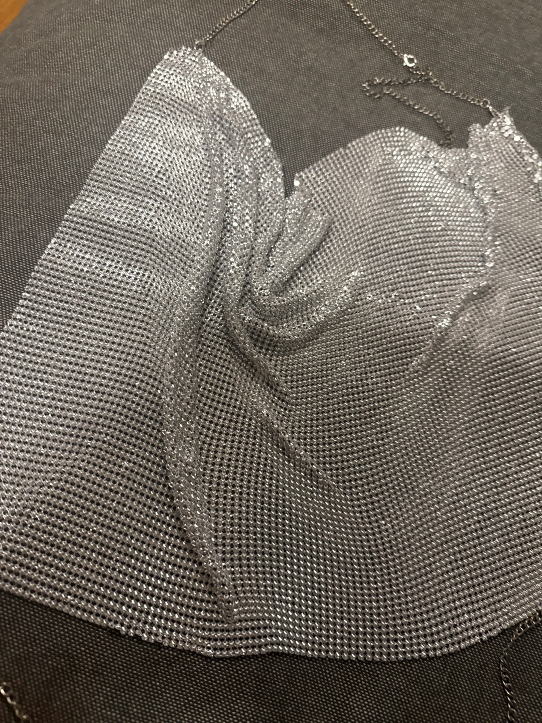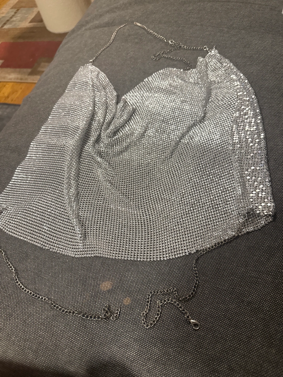 Here's a shimmering silver chainmail halter top! It's perfect for adding a touch of sparkle to your outfit. The chainmail design catches the light beautifully, making it a real statement piece