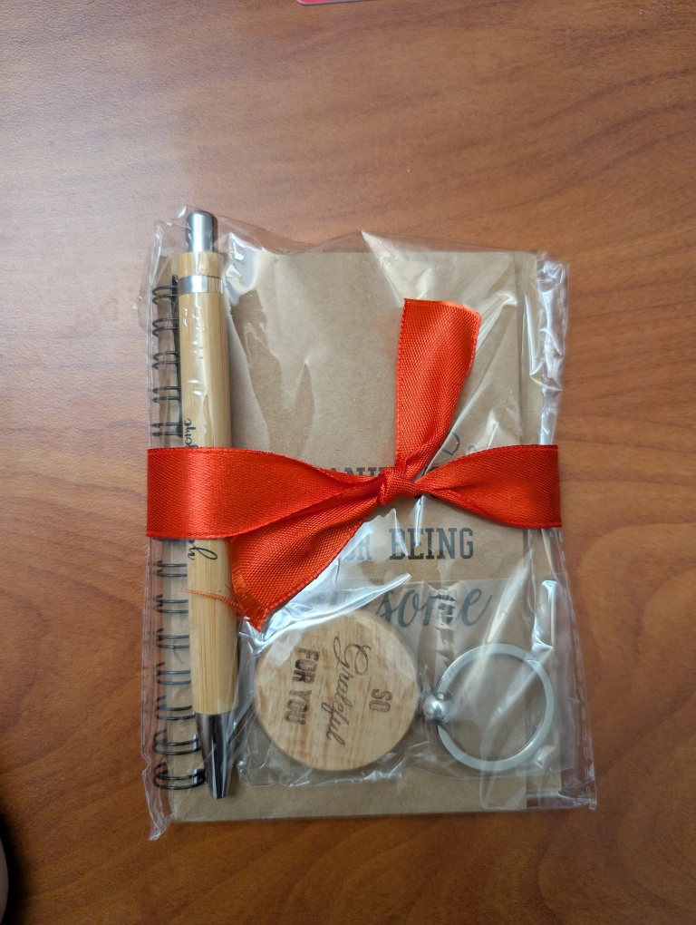 I have a brand new gift set that includes a pen, a small notebook, and a keychain. It's still in its original packaging and tied with a ribbon. The keychain says 'So Grateful For You'. Great as a small gift! The notebook says "thank you for being awesome". Great gift for friends or teachers.