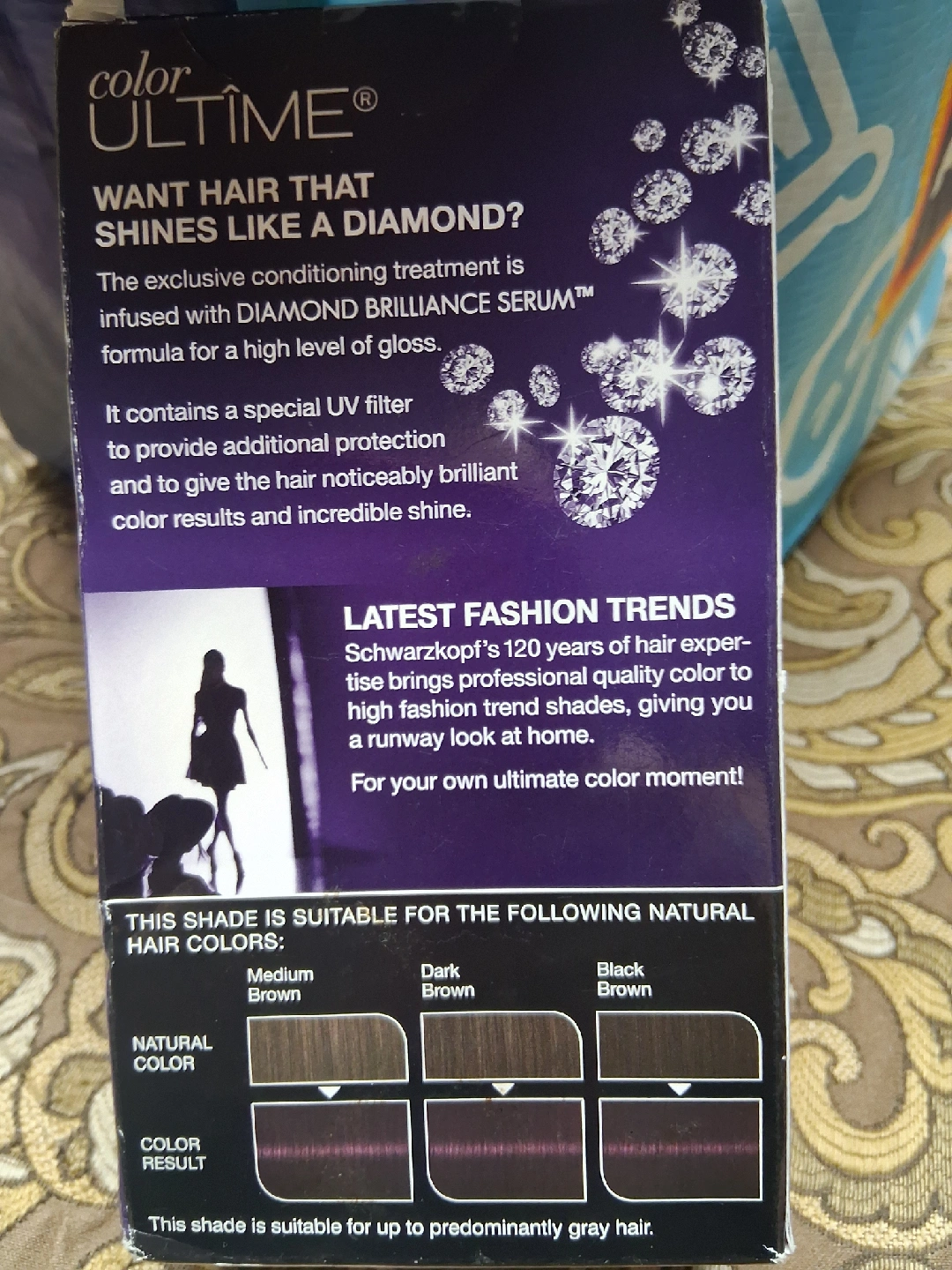 Selling a box of Schwarzkopf Color Ultime in Amethyst Black (3.3)! It's a permanent hair color with diamond brilliance serum for a high level of gloss. The color is fade-resistant for up to 9 weeks and provides a vibrant and intense color result. This shade is suitable for medium brown, dark brown, and black-brown natural hair colors