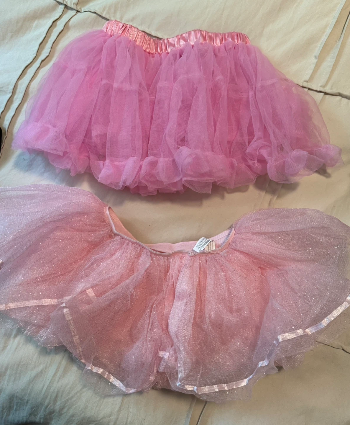 set of two adorable pink tutu skirts! One is a brighter, solid pink, and the other is a lighter pink with a touch of sparkle and ribbon trim. Perfect for dress-up or dance class