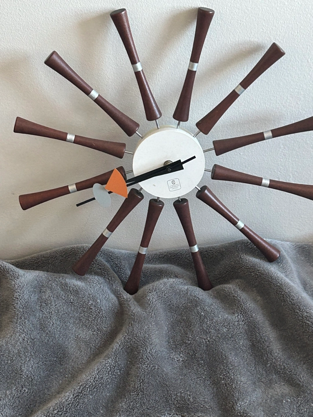 Selling a Cuppetry mid-century modern starburst clock! It features a white center with dark brown wooden rays and silver accents. It's a stylish piece to add to any room