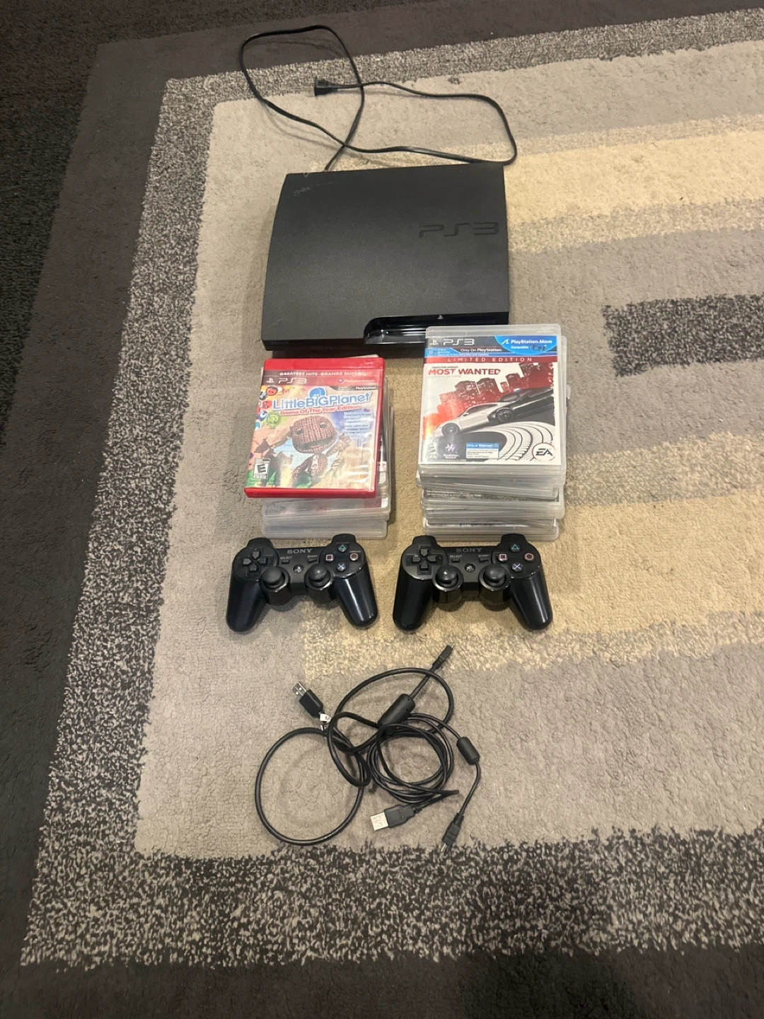 20Selling a PlayStation 3 console with a bunch of games and two controllers. Includes games like Little Big Planet and Need for Speed Most Wanted. Everything is in good working condition and ready for a new home!