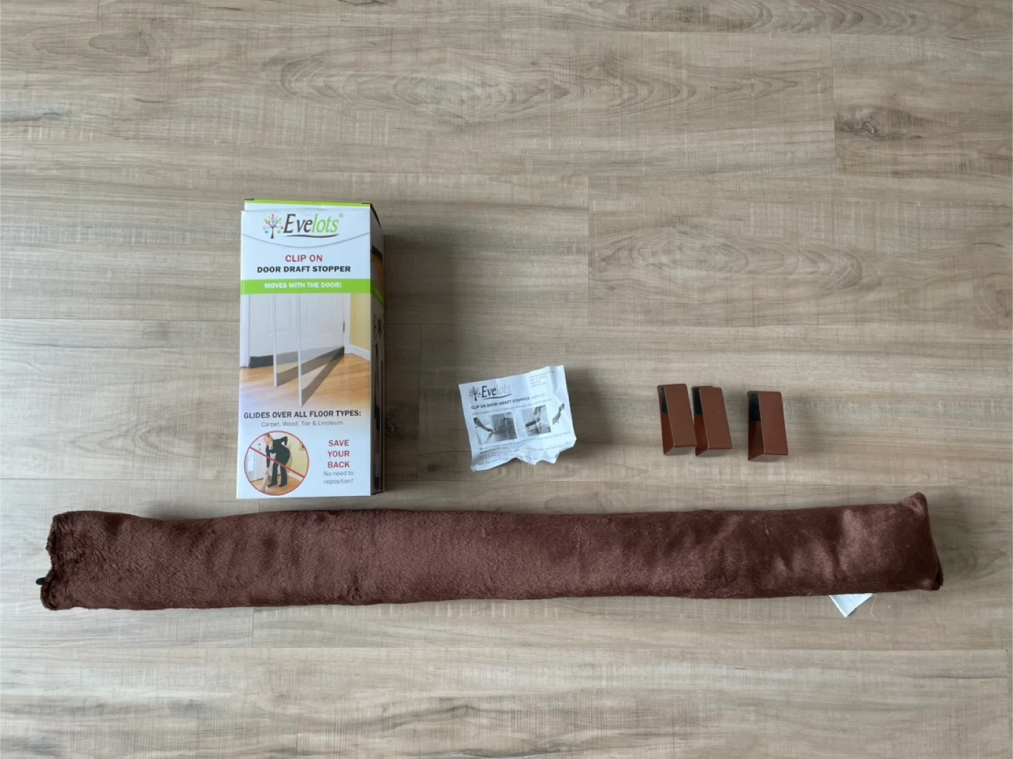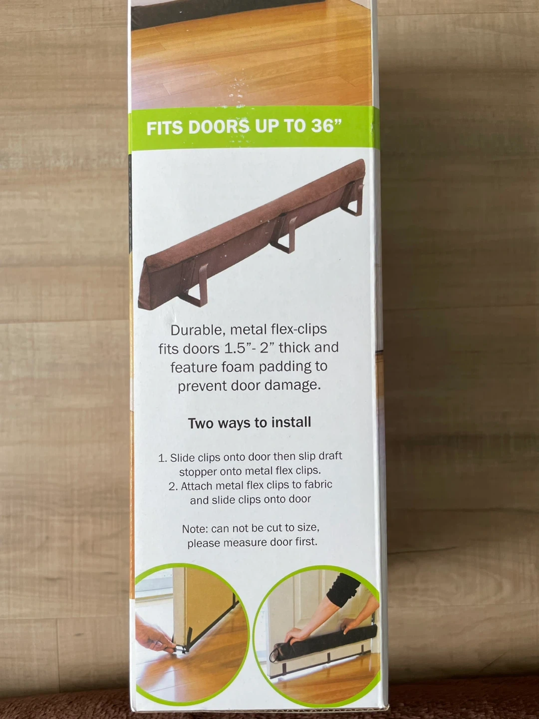 10Evelots clip-on door draft stopper. It's designed to fit doors up to 36 inches wide. The stopper features durable, metal flex-clips and is 1.5-2 inches thick with foam padding to prevent door damage. It glides over all floor types.