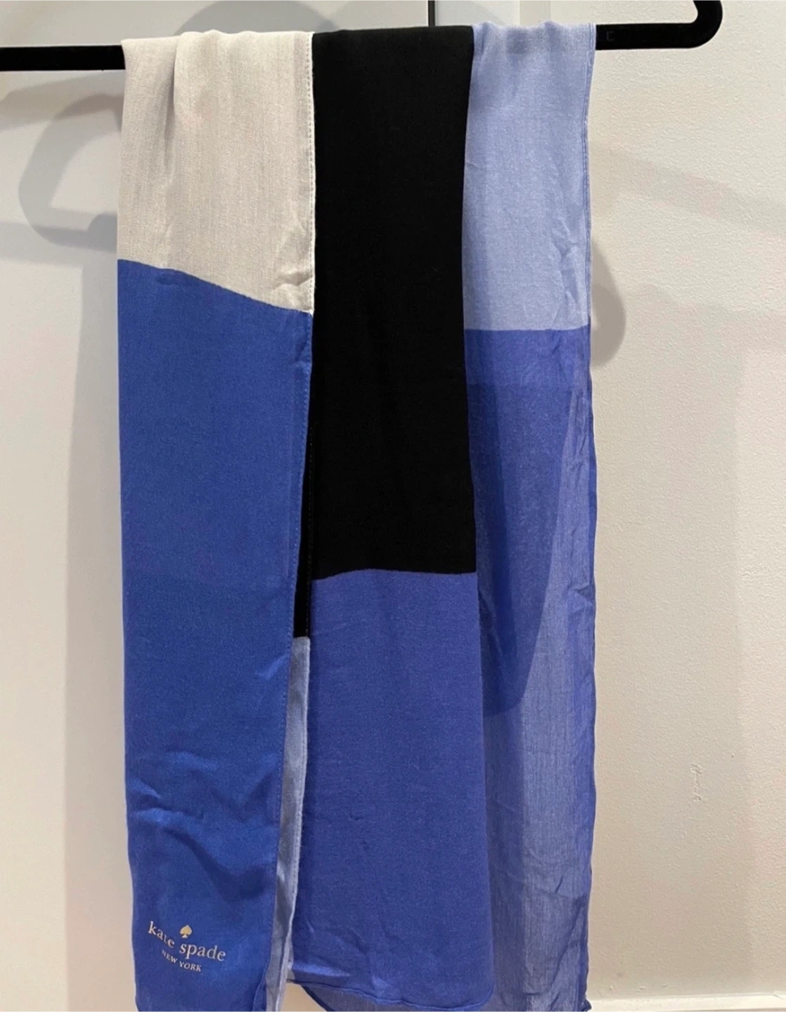 10Kate Spade scarf with a stylish colorblock design! It features a mix of blue, black, and white. Rectangle shaped.
