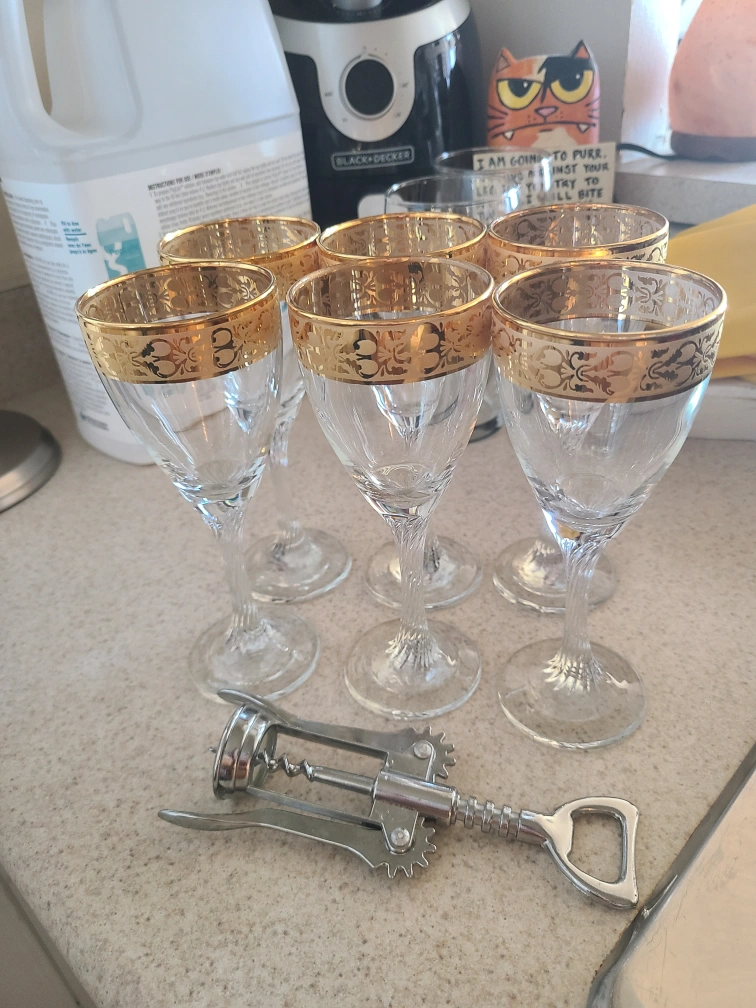 1000+Selling a set of six elegant wine glasses. They feature a delicate gold trim around the rim, adding a touch of sophistication to any occasion. Perfect for enjoying your favourite wines with friends and family!