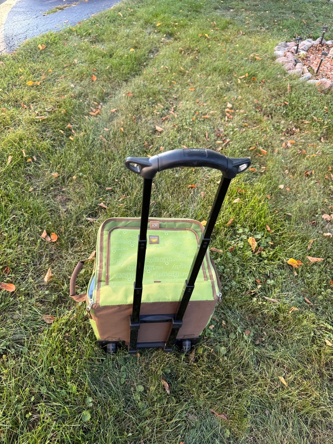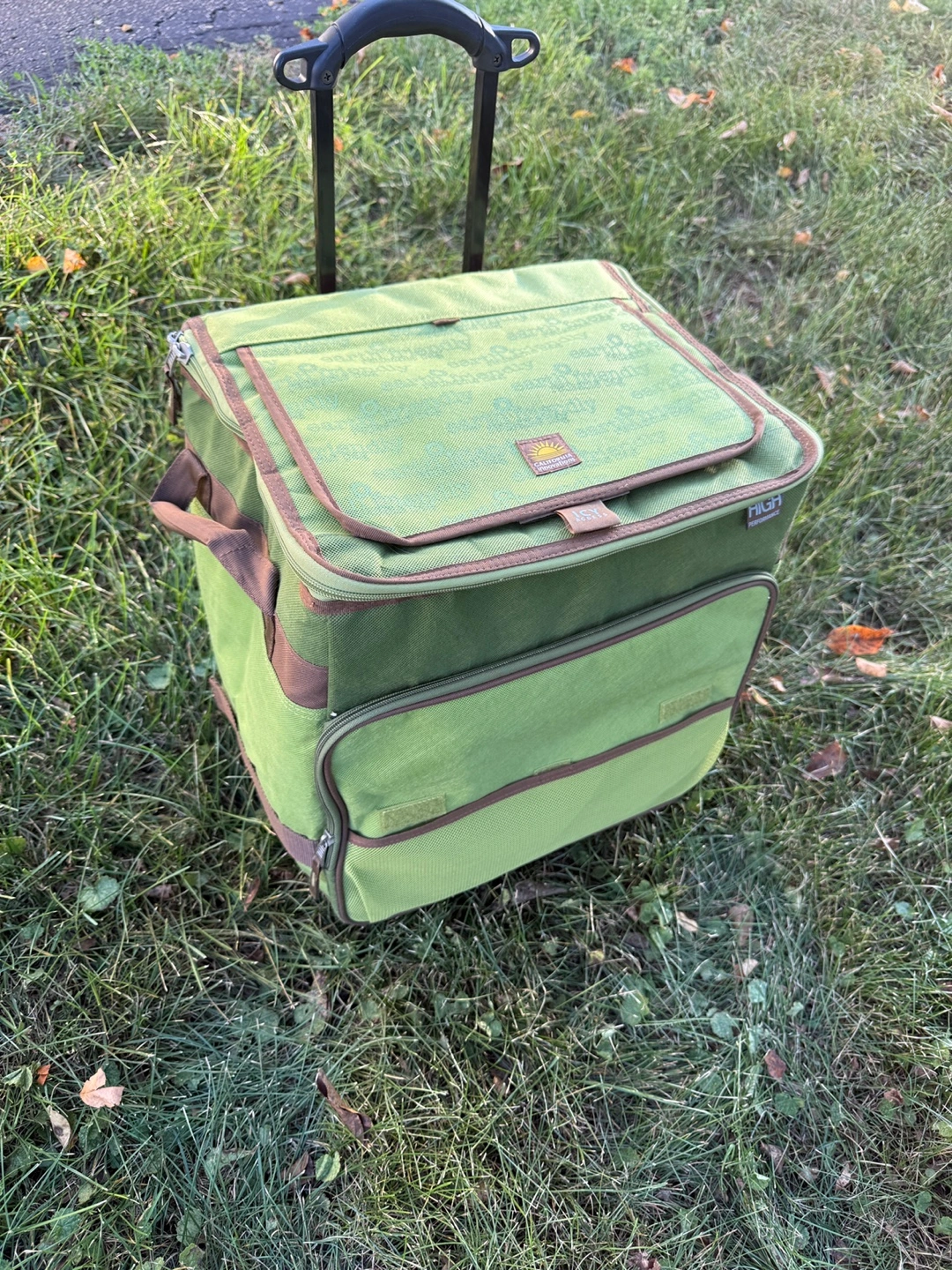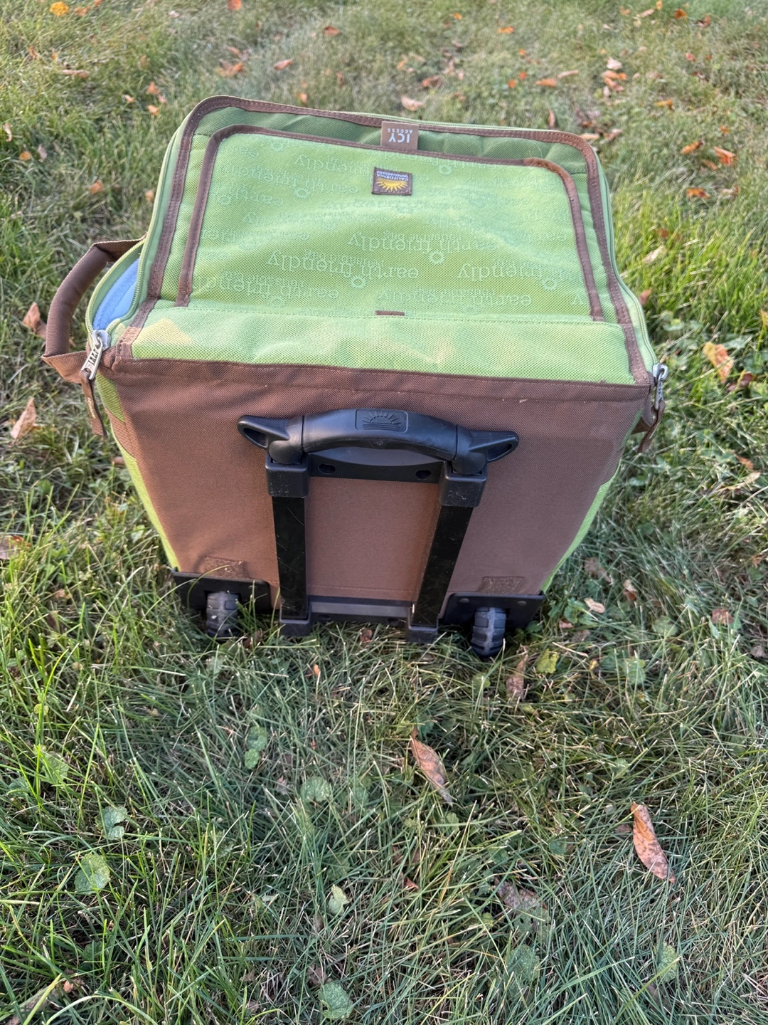 10Brand New This rolling cooler bag is perfect for picnics, camping, or any outdoor event where you want to keep your food and drinks cold. It's green and has a convenient handle and wheels for easy transport. It says "earth friendly" on the top. Folds slim for storage Expandable handle Located in Lake Villa near 132 & 59