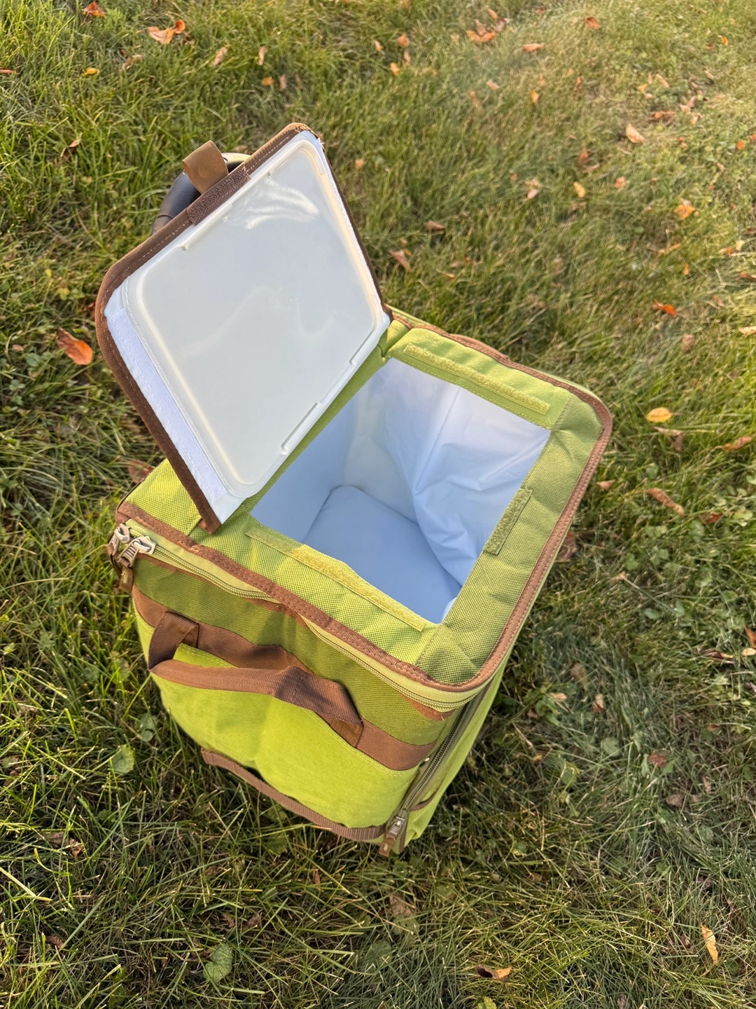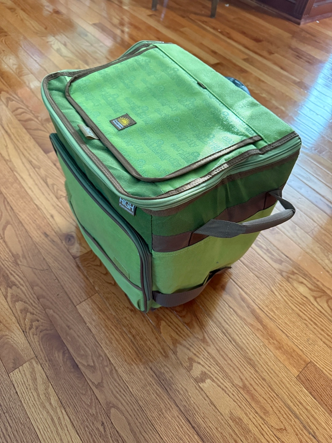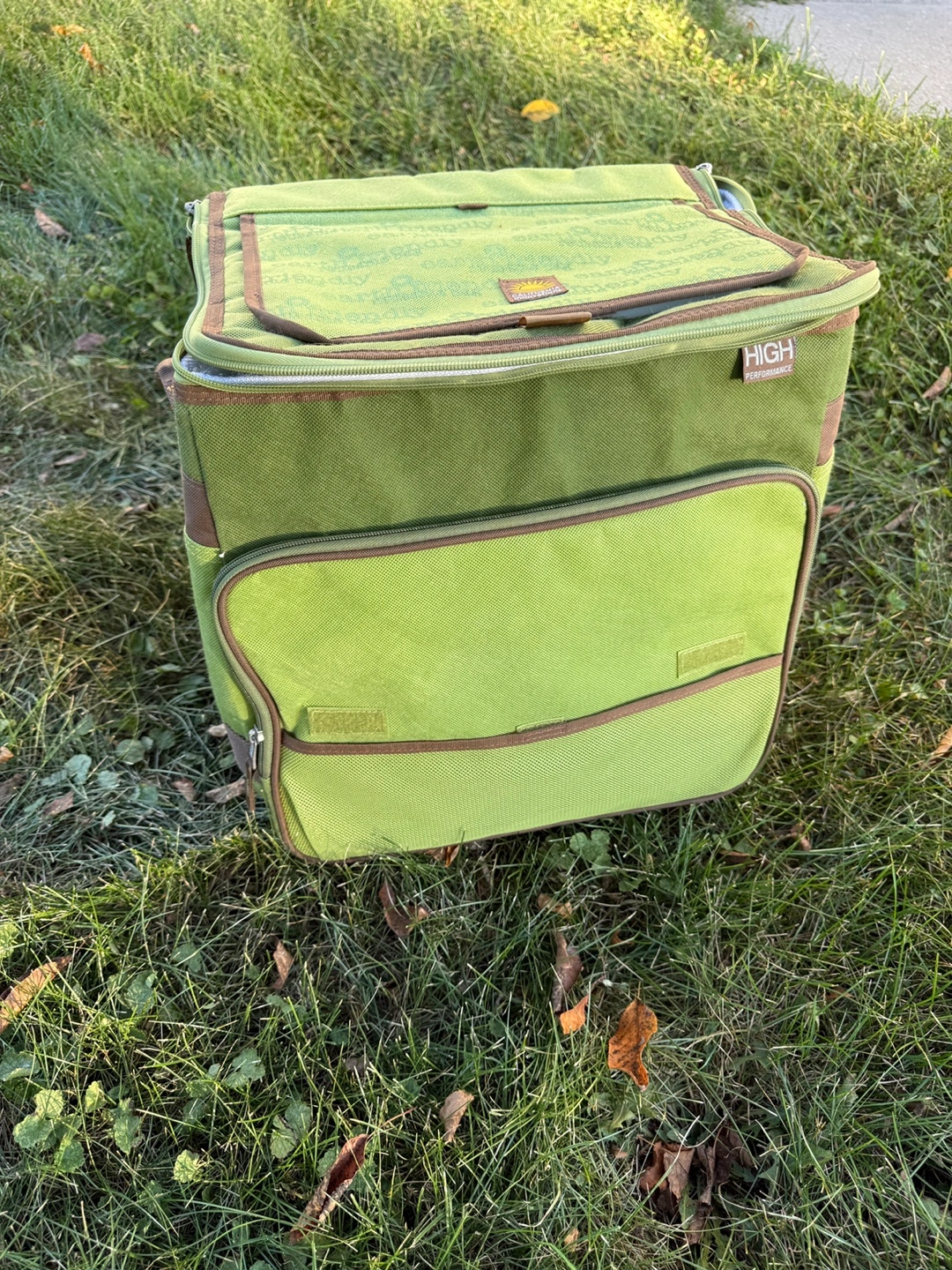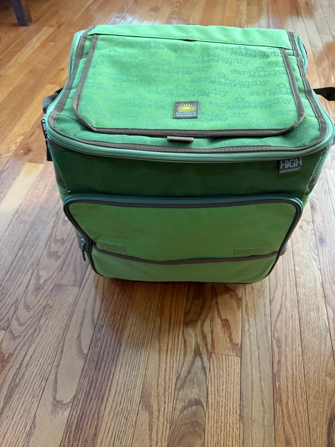10Brand New This rolling cooler bag is perfect for picnics, camping, or any outdoor event where you want to keep your food and drinks cold. It's green and has a convenient handle and wheels for easy transport. It says "earth friendly" on the top. Folds slim for storage Expandable handle Located in Lake Villa near 132 & 59