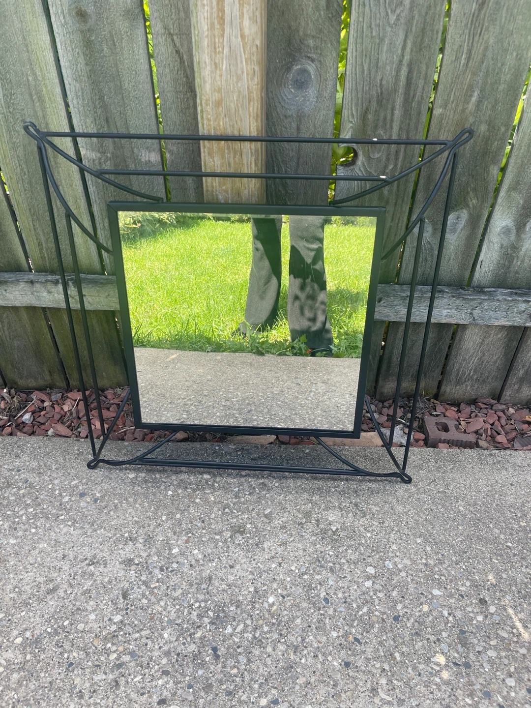 Here's a cool square mirror with a black metal frame! It's in great condition and ready to add a unique touch to your space in back some water damage as seen in picture