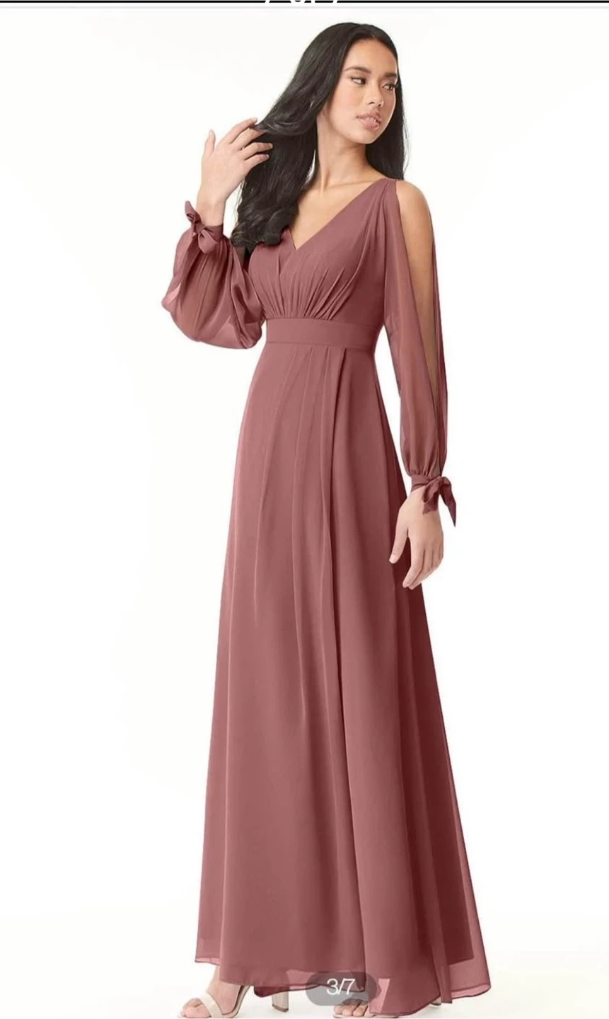 Beautiful Azazie bridesmaid dress in a lovely dusty rose color. It's a flowy, elegant gown that would be perfect for a wedding or special occasion. The dress features long sleeves with tie details and a flattering V-neckline.