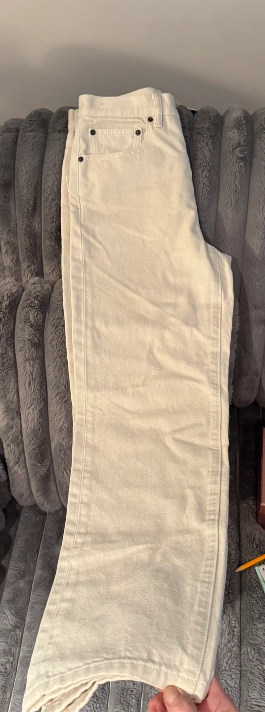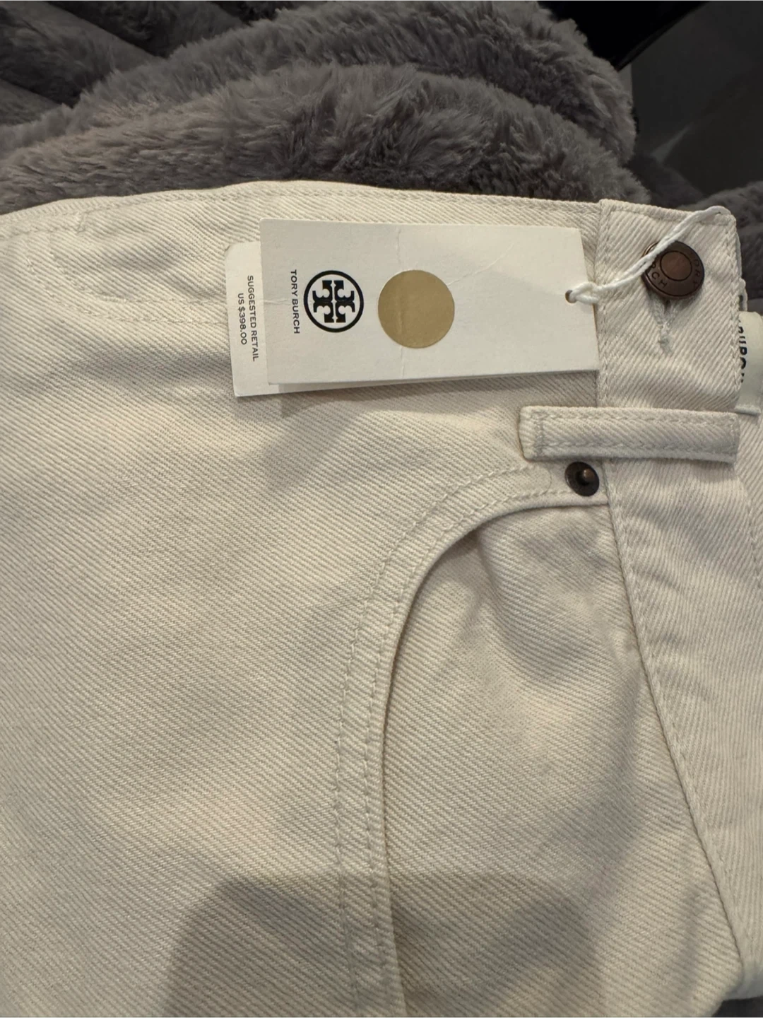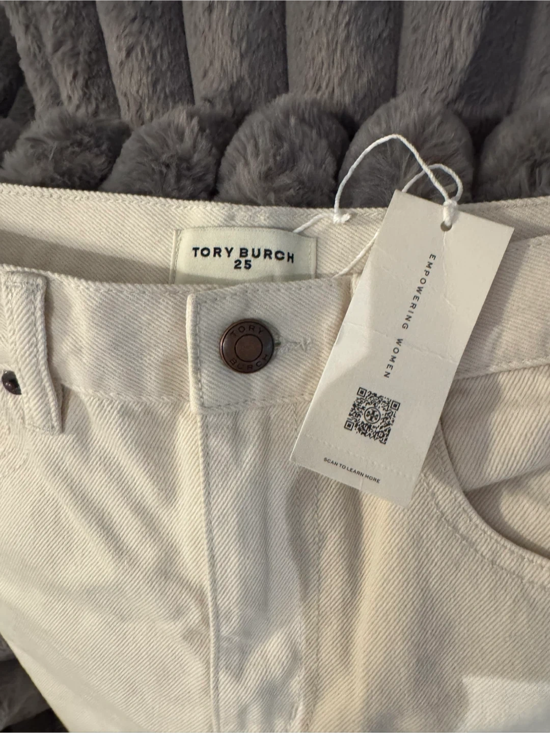 These are a pair of Tory Burch white jeans in size 25. They are in good condition and the tag is still attached! There is a small pencil or pen mark on the front of the jeans.