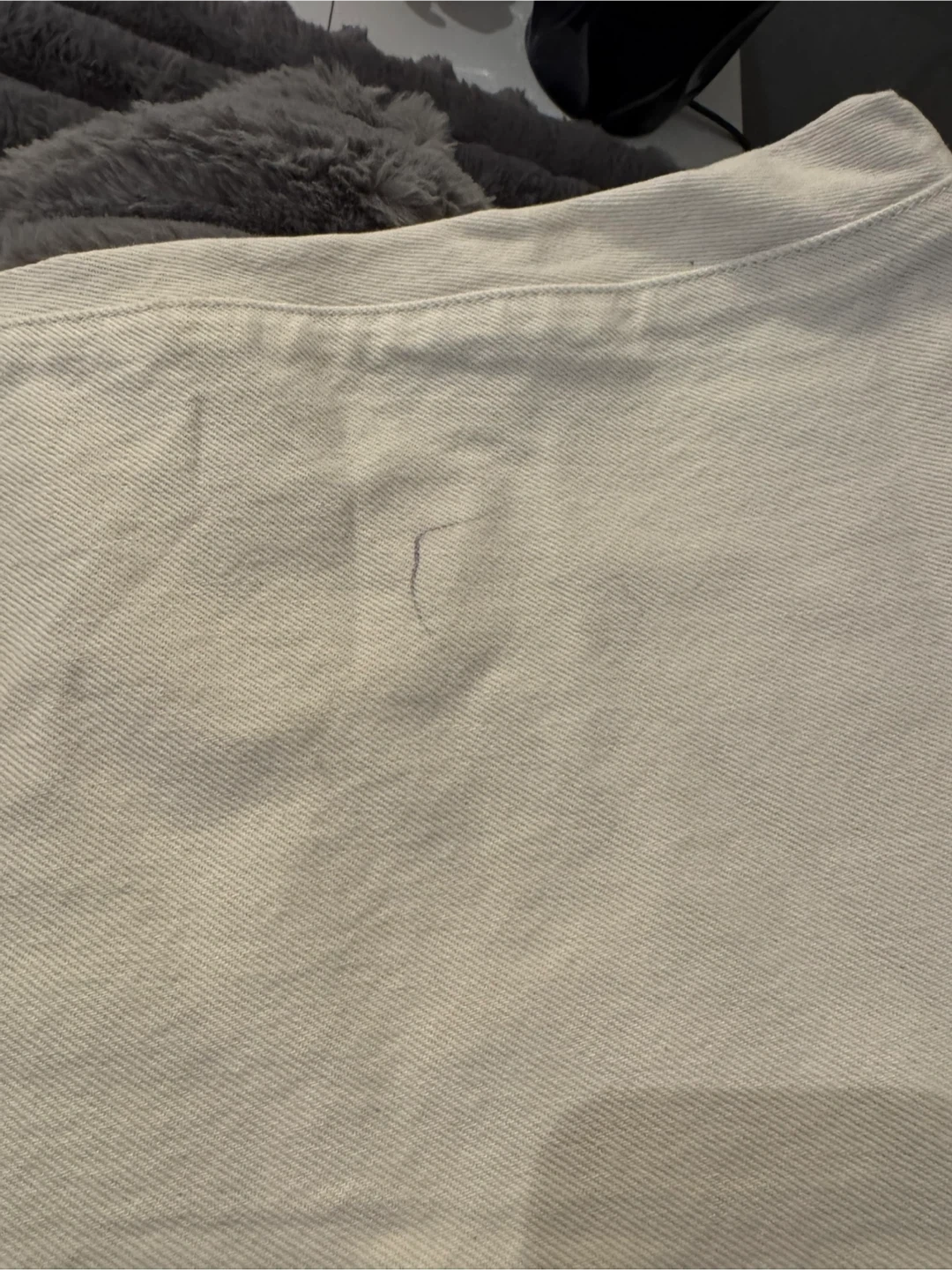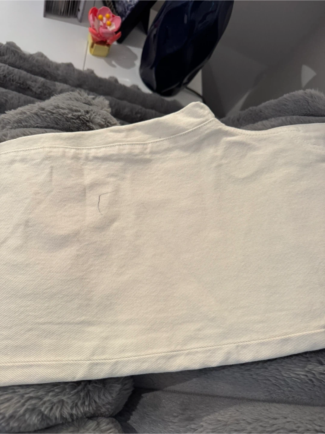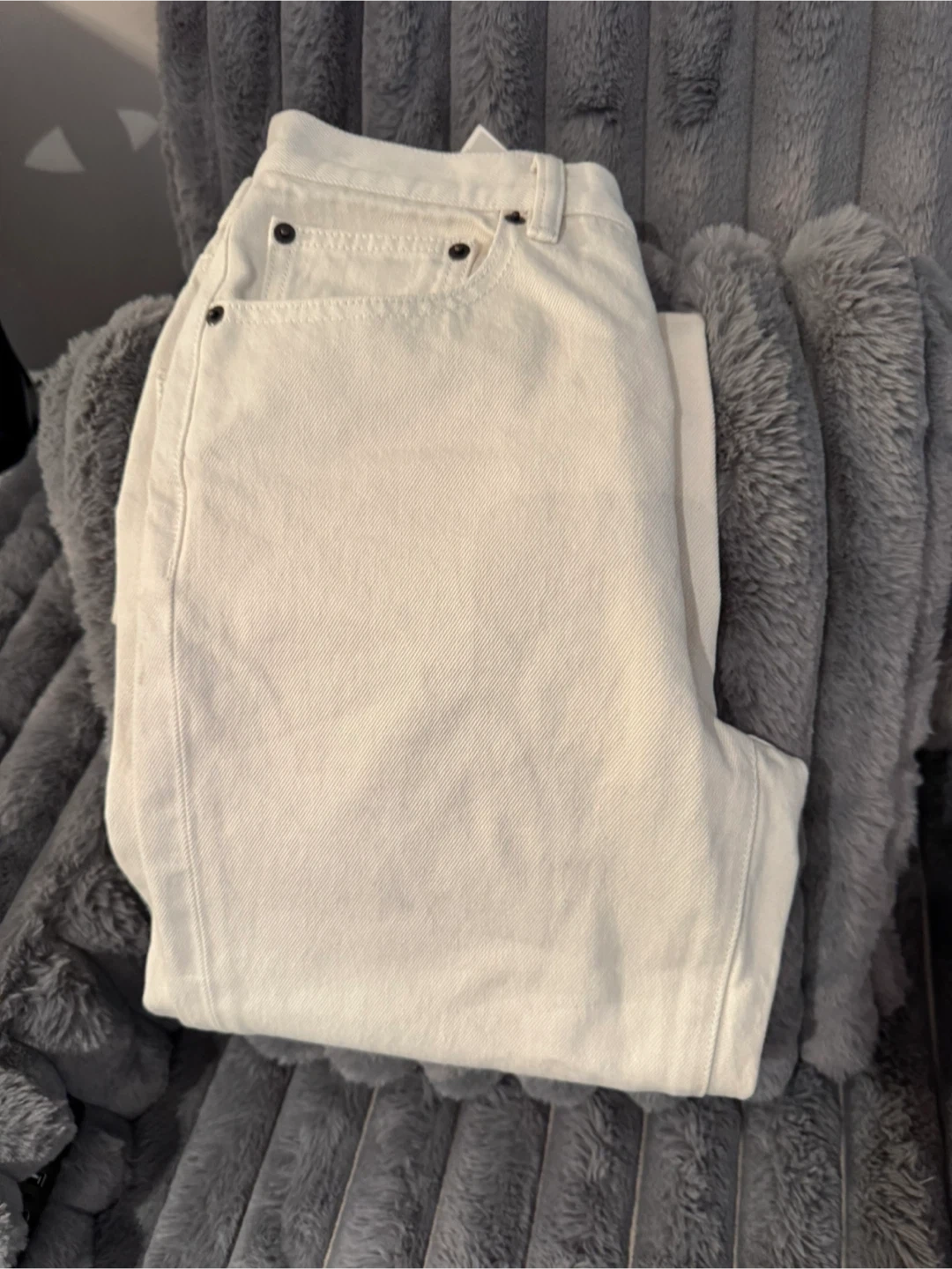 These are a pair of Tory Burch white jeans in size 25. They are in good condition and the tag is still attached! There is a small pencil or pen mark on the front of the jeans.