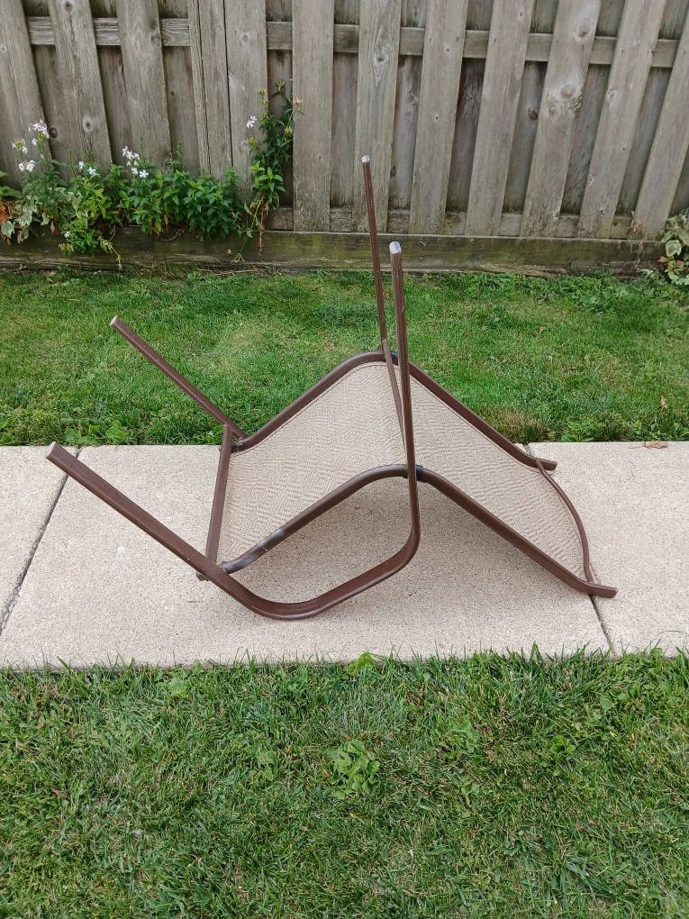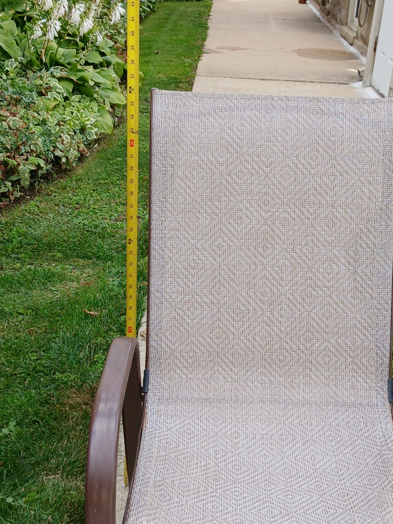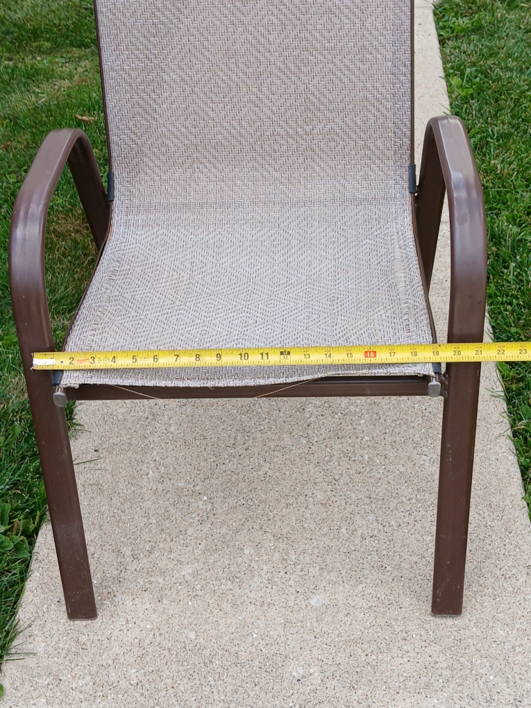 Comfortable outdoor patio chair with a brown frame and woven seat. It measures approximately 36 inches in height and 21 inches in width. Great for relaxing in the backyard!. CASH only, no zelle, no Paypal.