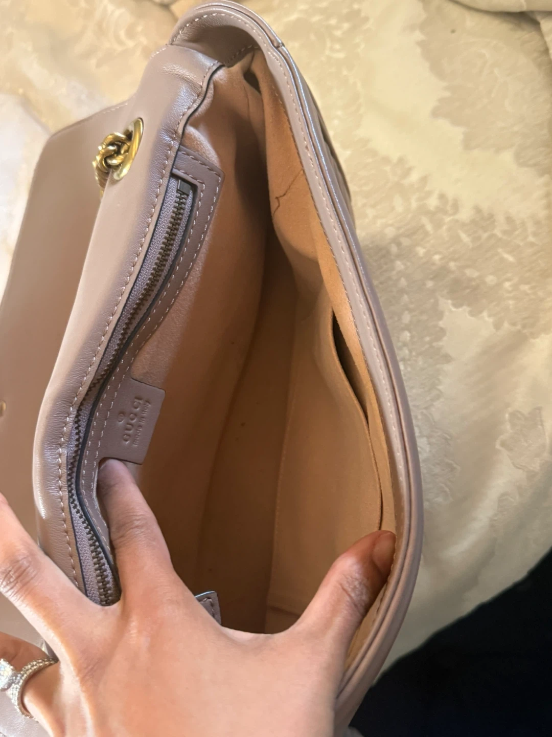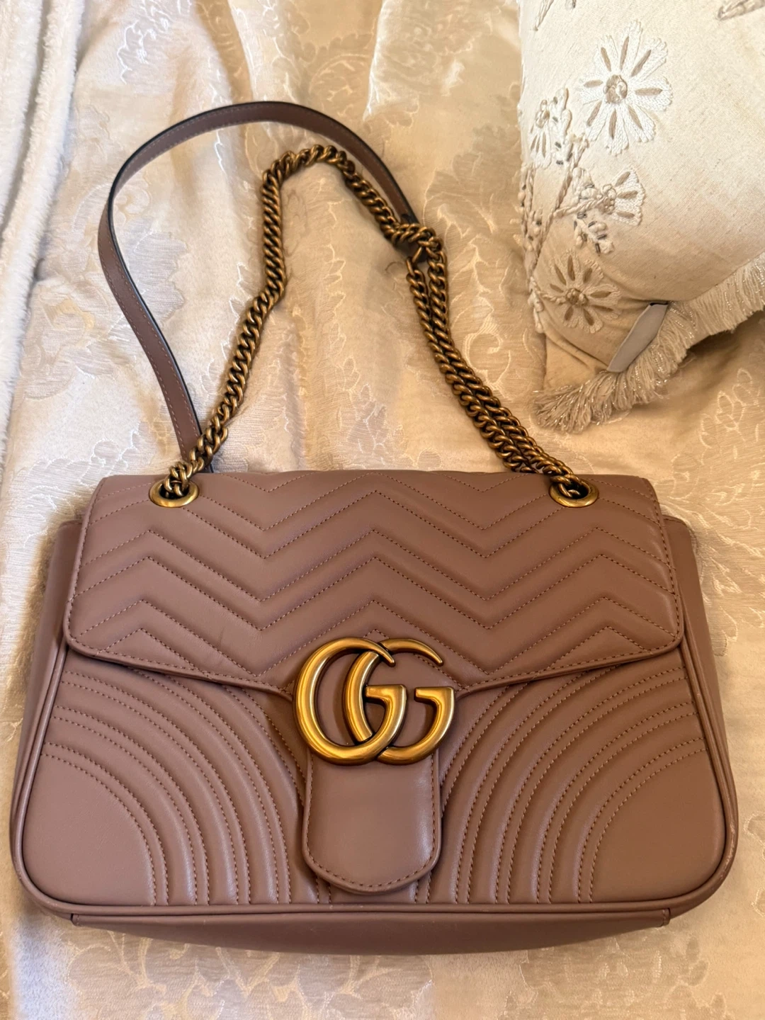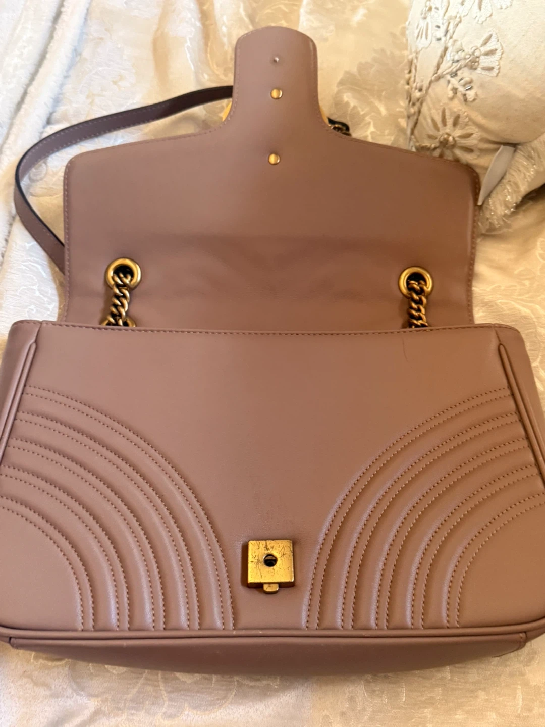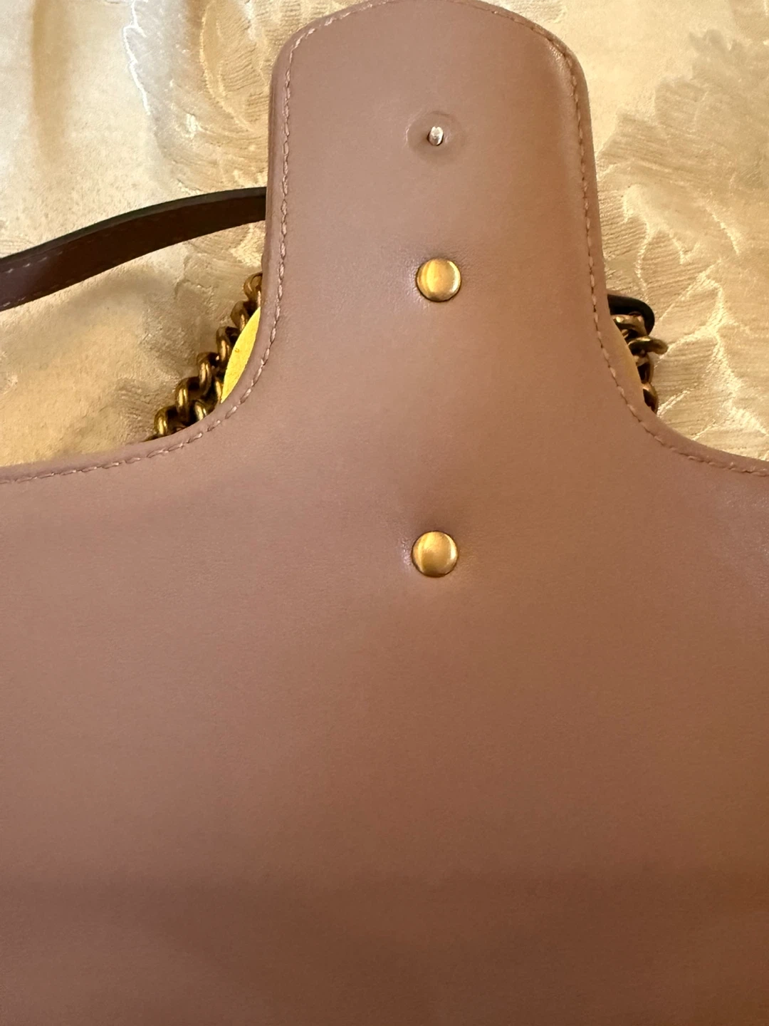 Selling a beautiful Gucci Marmont shoulder bag! It's in great condition and features the iconic GG logo. The bag is a lovely neutral color with gold-tone hardware. Perfect for adding a touch of luxury to any outfit. The screw on for the clamp is missing otherwise in great condition. Comes with original box and dust bag.