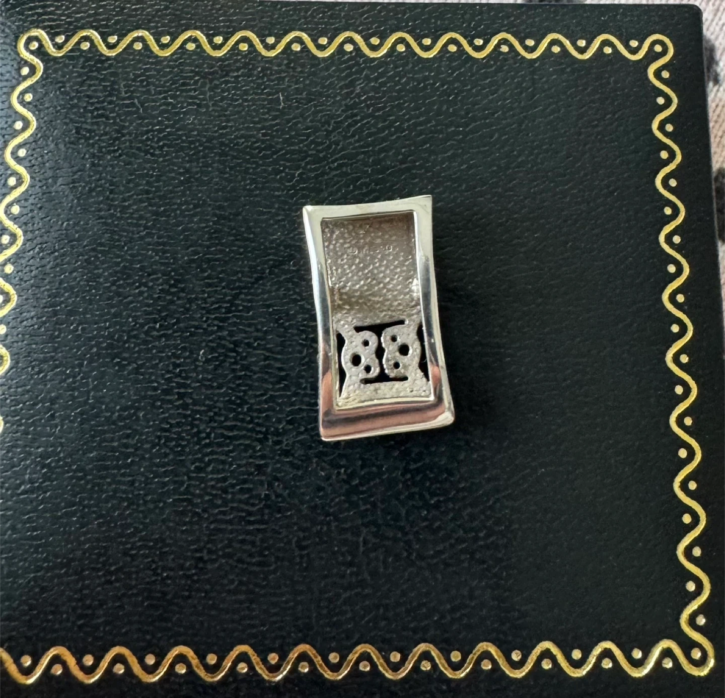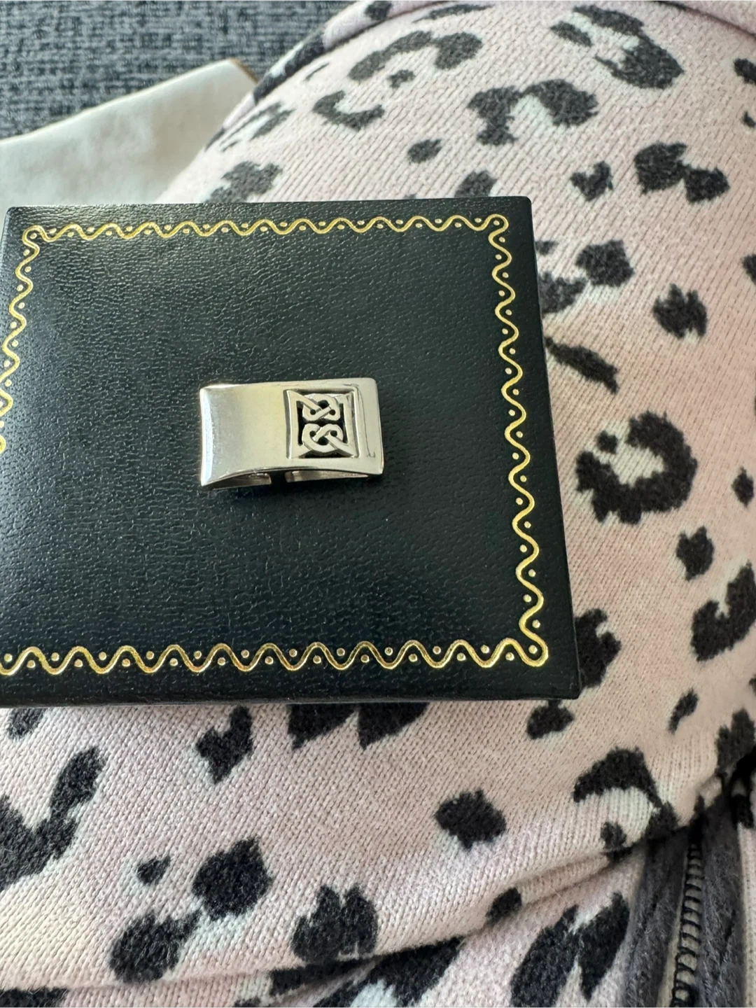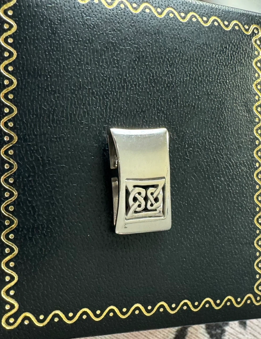 Selling a vintage necklace charm with a Celtic knot design. It comes in its original box. The charm is silver-colored and weighs 0.132 oz. 14k gold made in Ireland