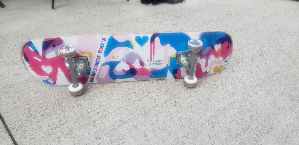 Selling a used skateboard. It has a black top and a colourful underside design with hearts and abstract shapes. It looks like it has been used but is still in good shape for some fun rides! good condition pickup location: Bradford, Ontario