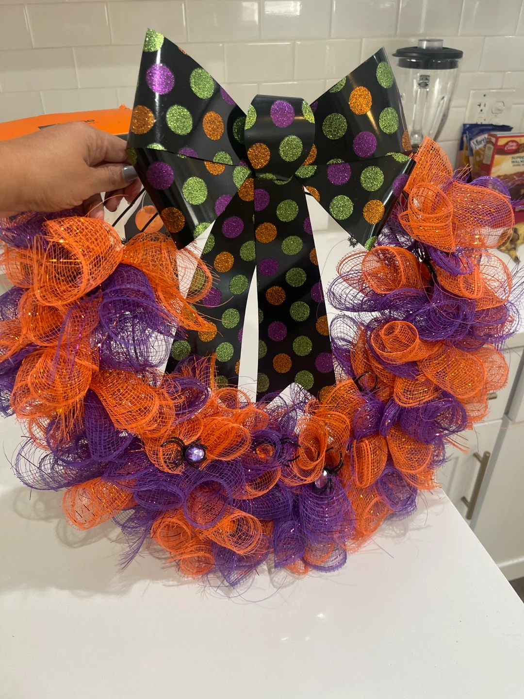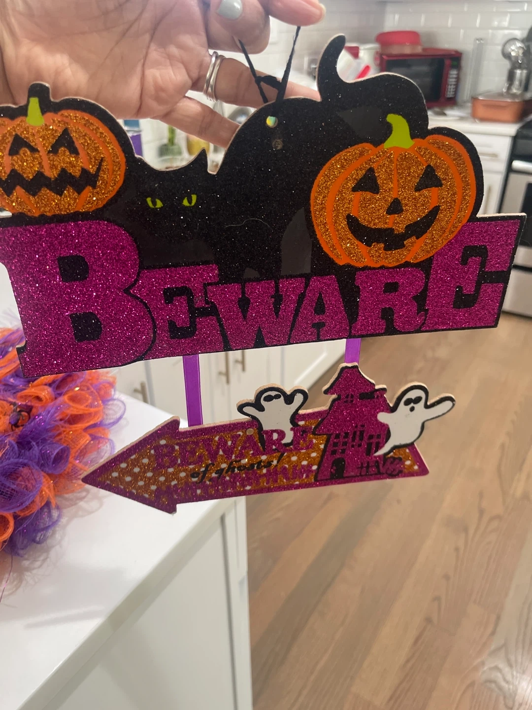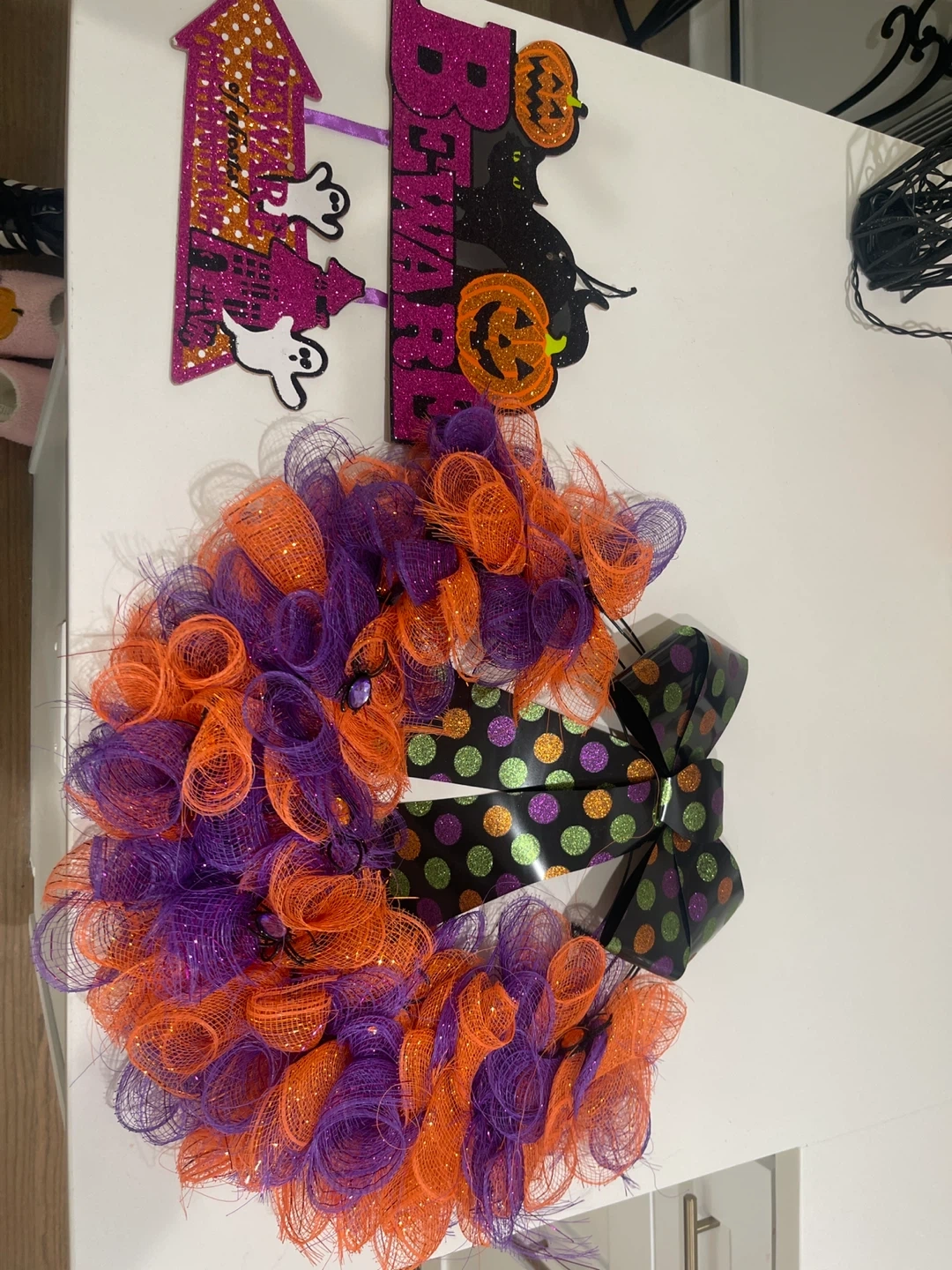 Get ready for Halloween with this festive wreath! It features a mix of orange and purple mesh, plus a fun 'Beware' sign with pumpkins, a black cat, and ghosts. Perfect for adding a spooky touch to your door or wall this October