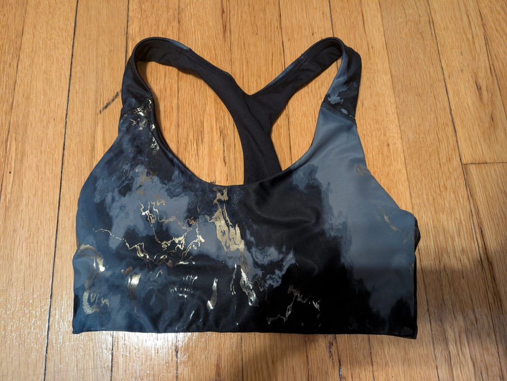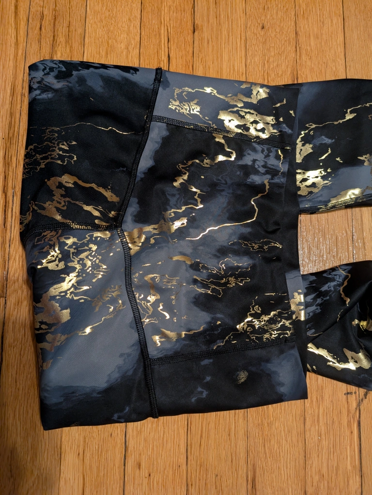 Selling a cute activewear set! It features a black marble pattern with gold accents. The set includes a sports bra and leggings, perfect for your next workout. like new, worn twice. both are size small. bra has removable pads. legging has high waistband