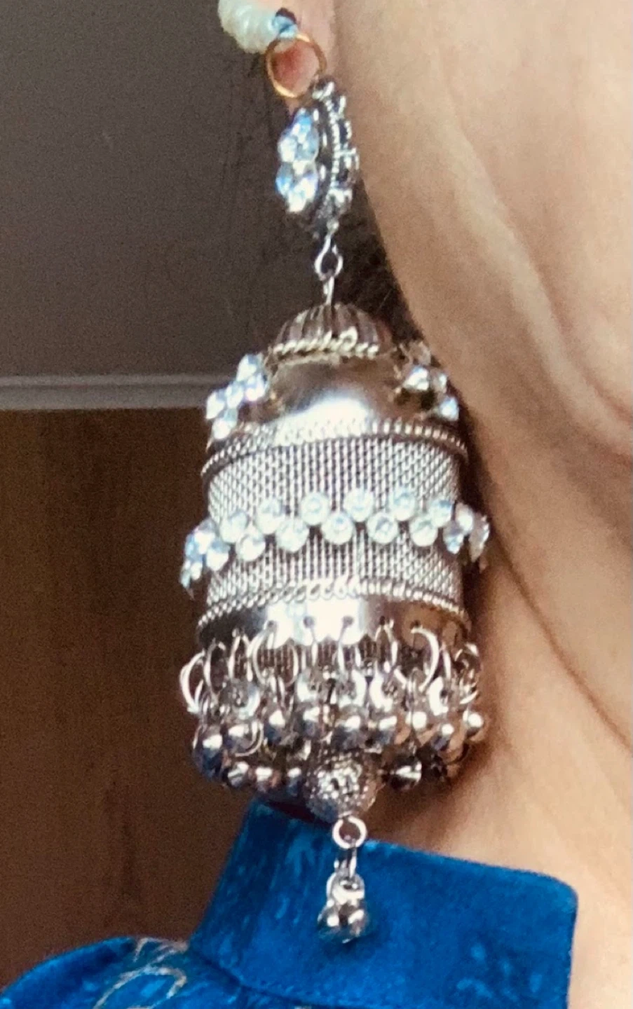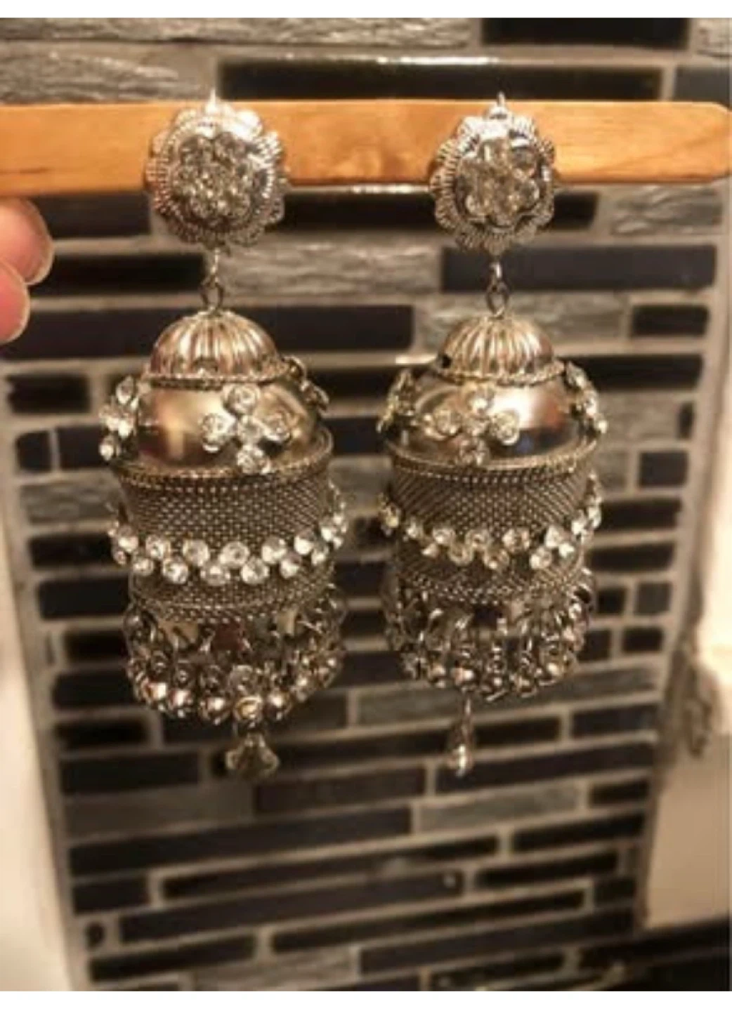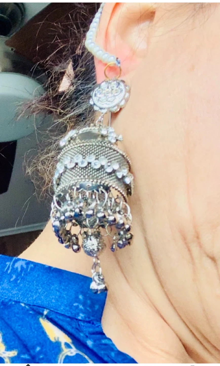 These are a pair of silver dangle earrings. They have a unique, eye-catching design, perfect for adding a touch of elegance to any outfit. The earrings appear to be in good condition and ready to wear!