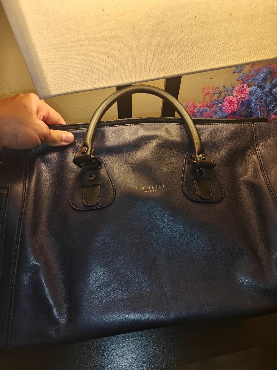 This is a beautiful Ted Baker London leather duffle bag. It's in used good condition and ready for a new home! The bag is a stylish dark blue color with black handles and trim no shoulder strap. Perfect for travel or everyday use