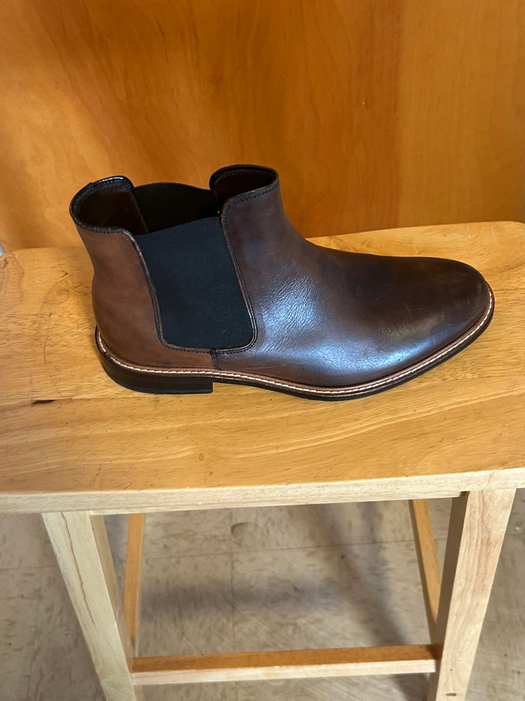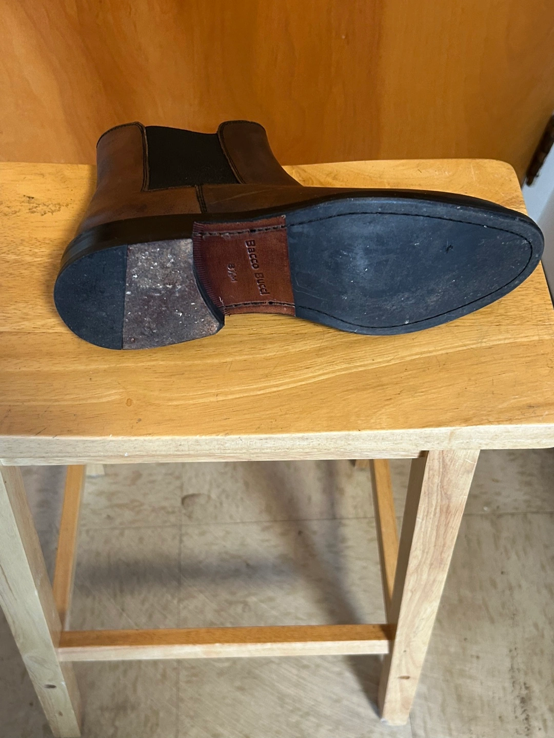 Selling a pair of made in Spain Bacco Bucci Chelsea boots in brown leather. They are in pristine condition and have a classic style. Perfect for dressing up or down! Top quality,leather soles and top are stitched not glued. New retail over $375.00