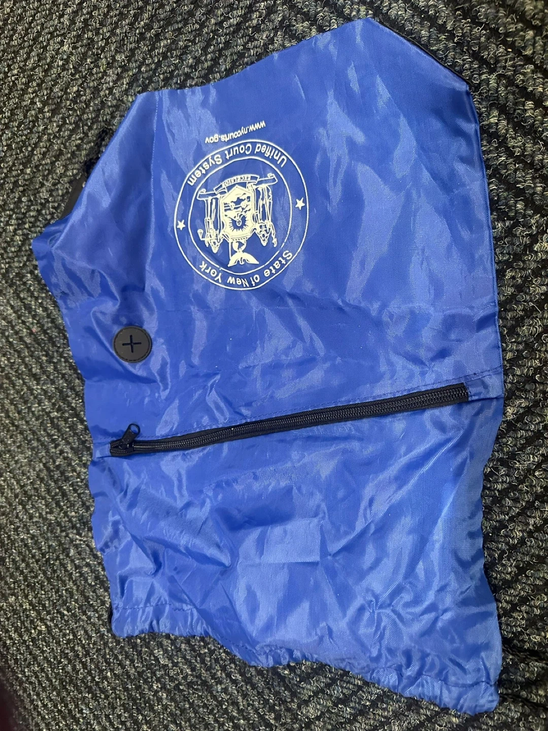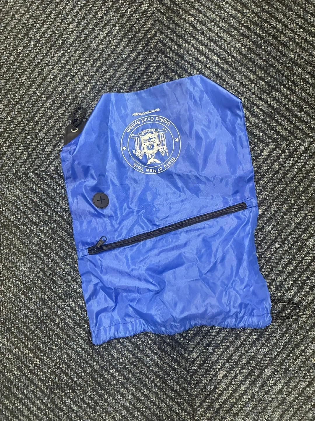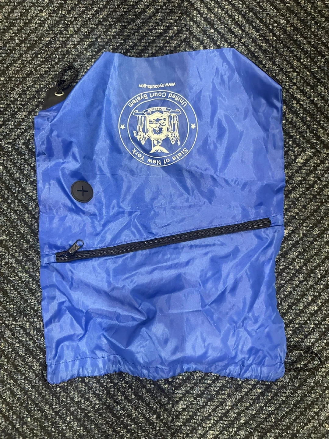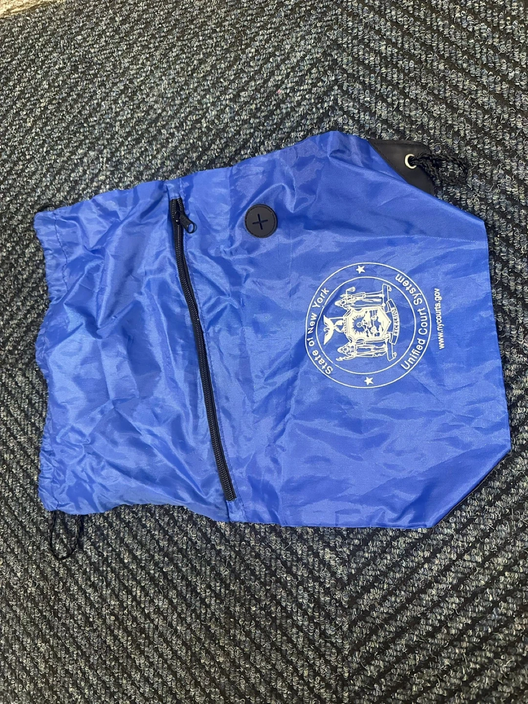 Selling a blue drawstring bag from the United Court System of the State of New York. It has a zipper and a button.
