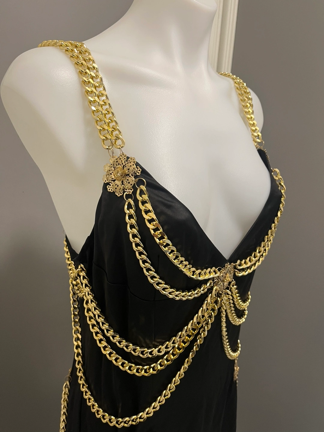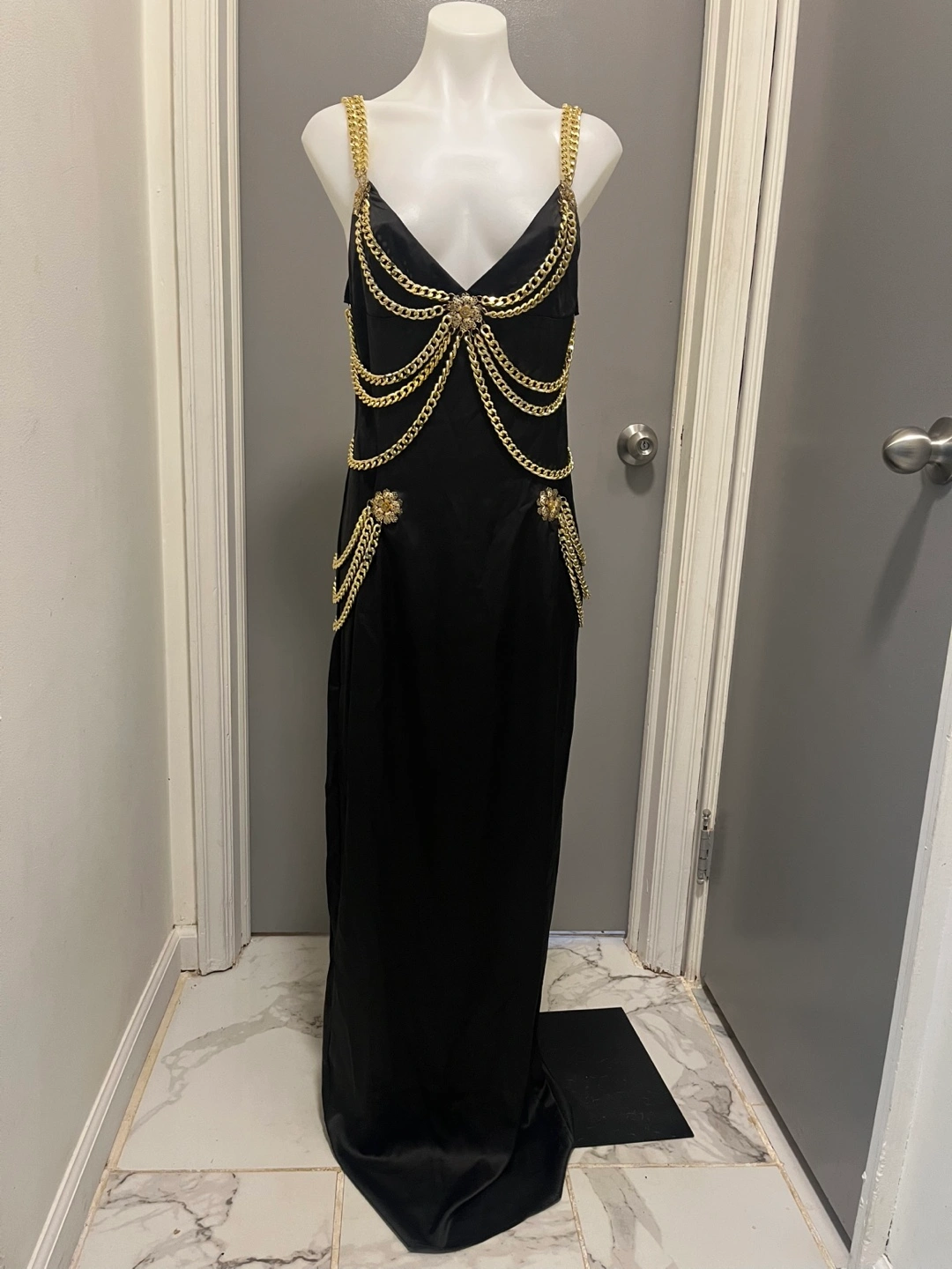 Brand new! Never worn!! Original price: $160 Selling a stunning black dress adorned with intricate gold chain details. This dress is perfect for a night out or a special occasion. It features a flattering silhouette and unique design elements that are sure to turn heads!