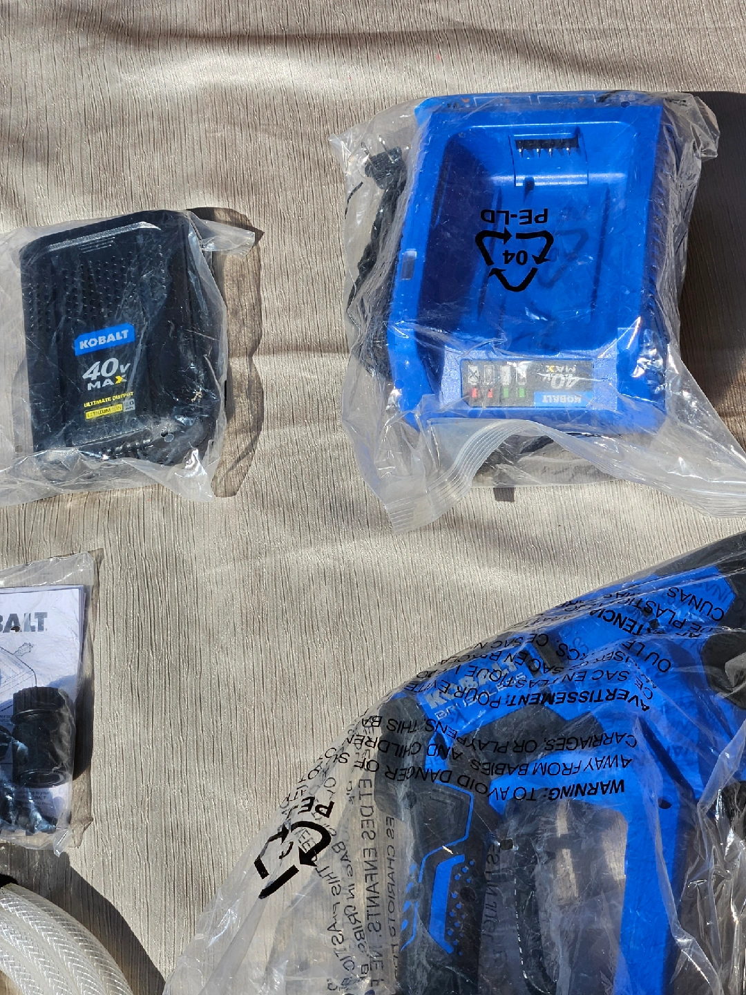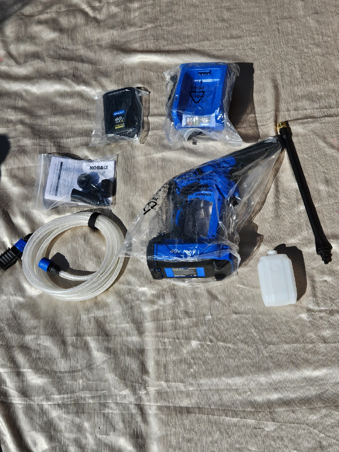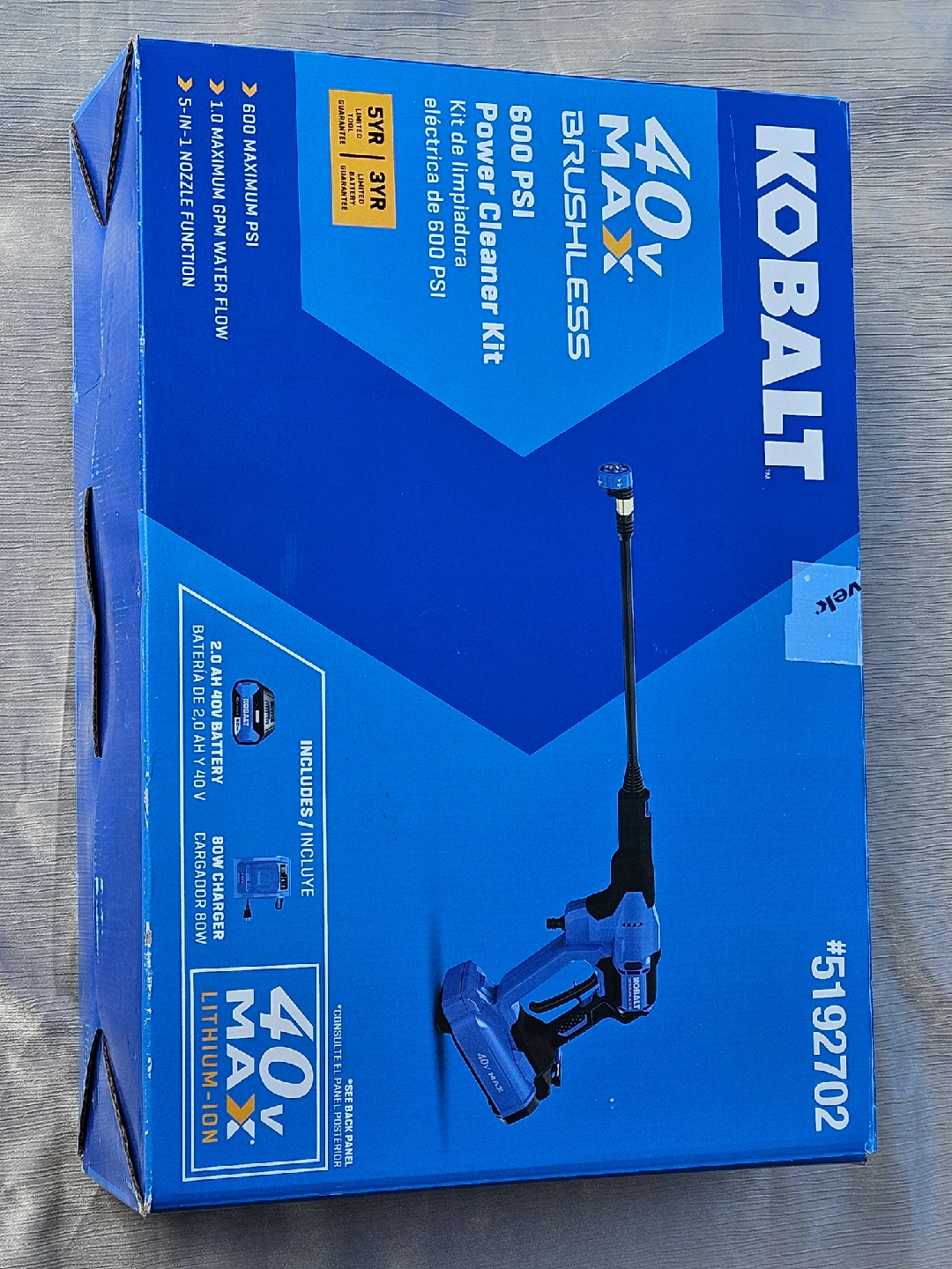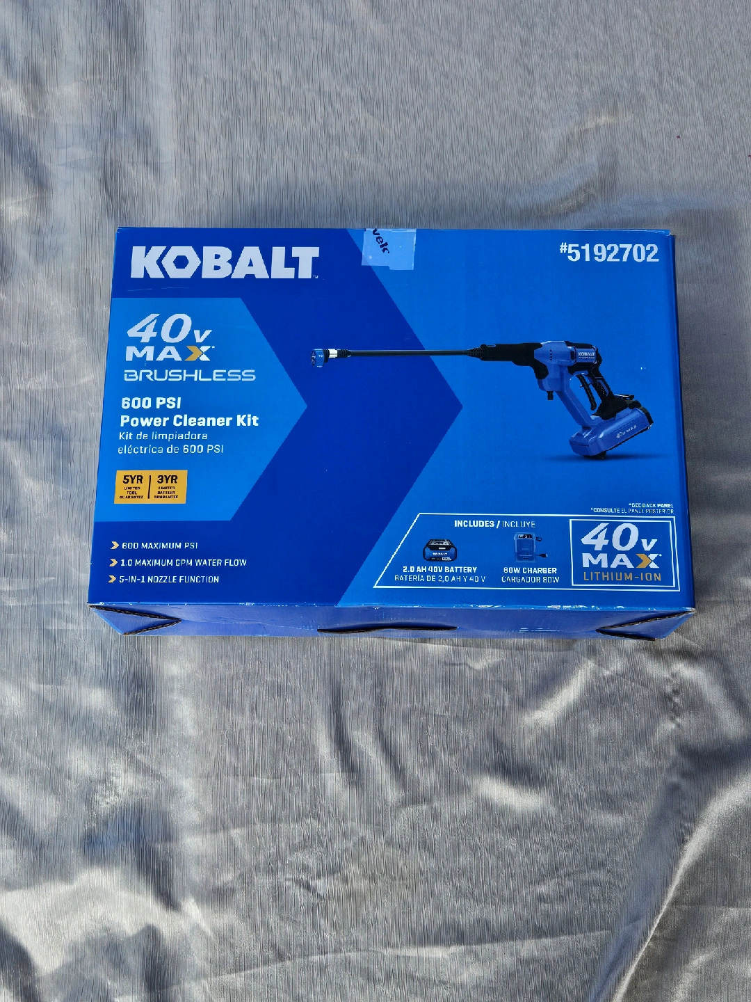 I have a brand new Kobalt 40V MAX Brushless 600 PSI Power Cleaner Kit for sale! It includes the 2.0 Ah 40V battery and 80W charger, along with the 5-in-1 nozzle function for maximum versatility. It delivers 0.60 GPM water flow at 600 maximum PSI. Comes with the original box