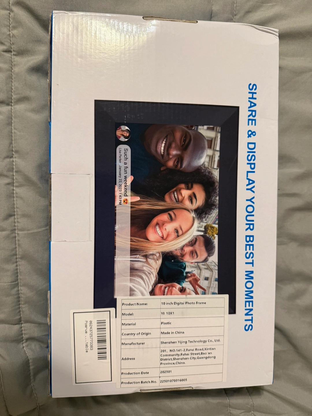 I'm selling a 10 inch Digital Photo Frame, model YI 10X1! It's made of plastic and is in great condition. It's perfect for sharing and displaying your best moments!