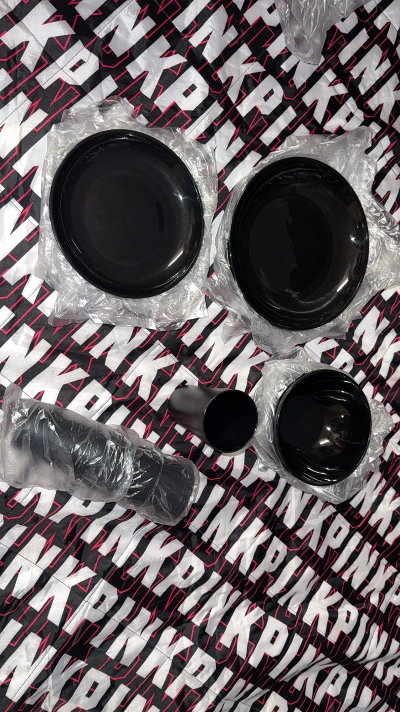 Selling a black dinnerware set. It includes plates, a bowl, and a cup. They are still in their original packaging!