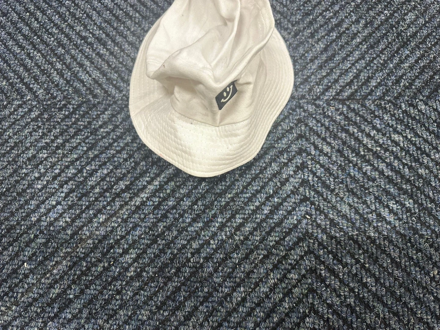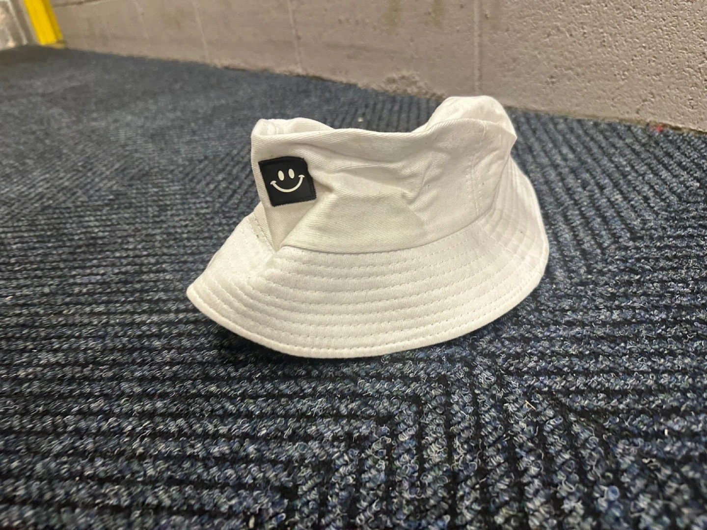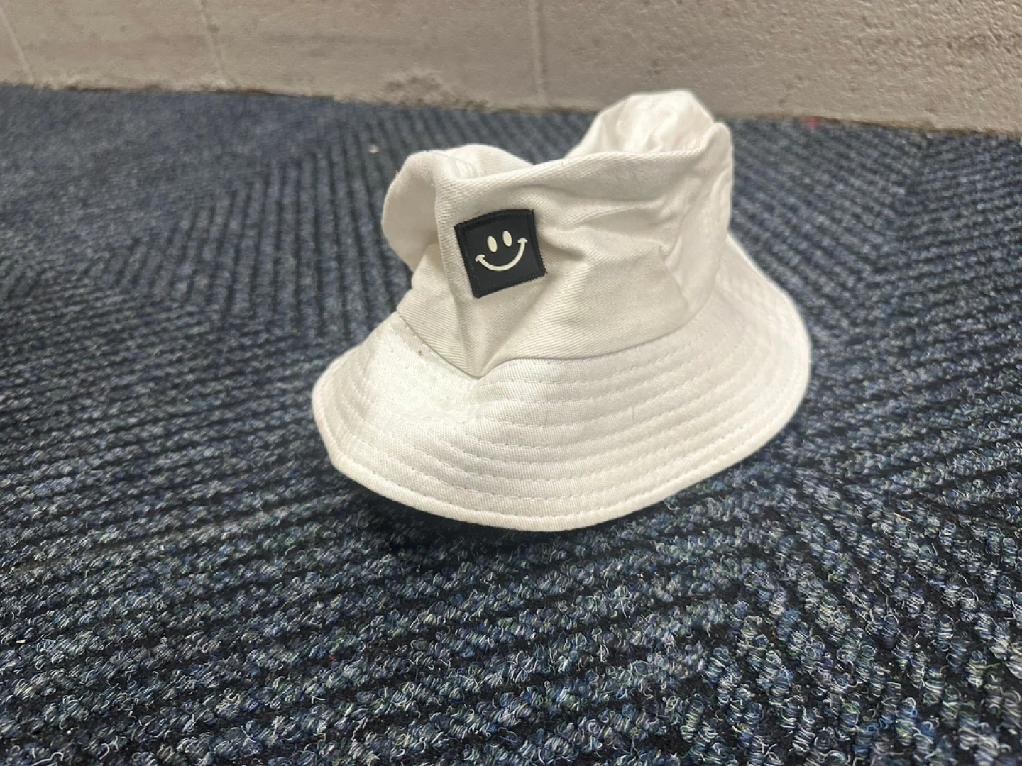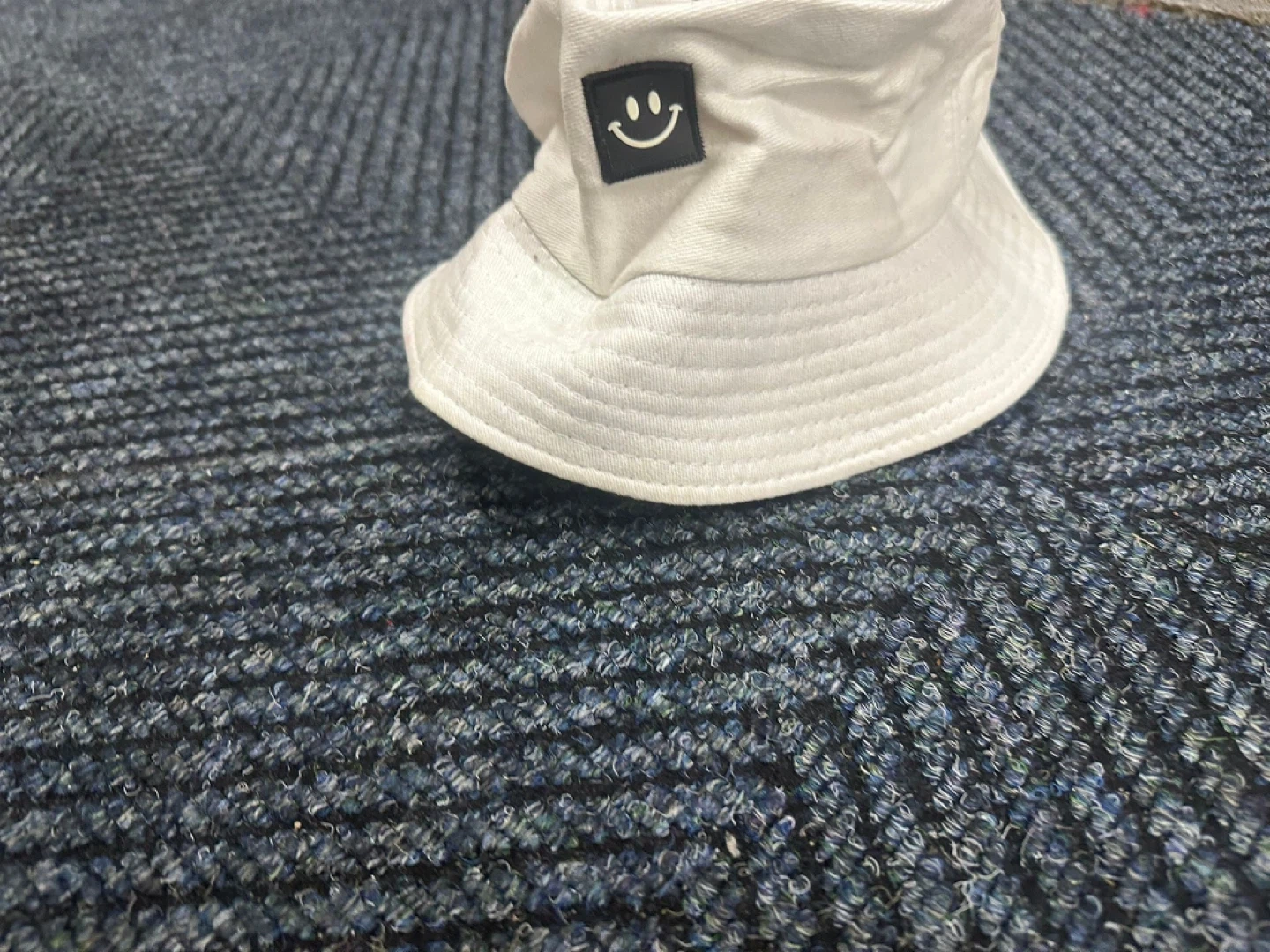 Selling a cute white bucket hat! It features a small black patch with a smiley face. Perfect for sunny days or adding a bit of fun to your outfit