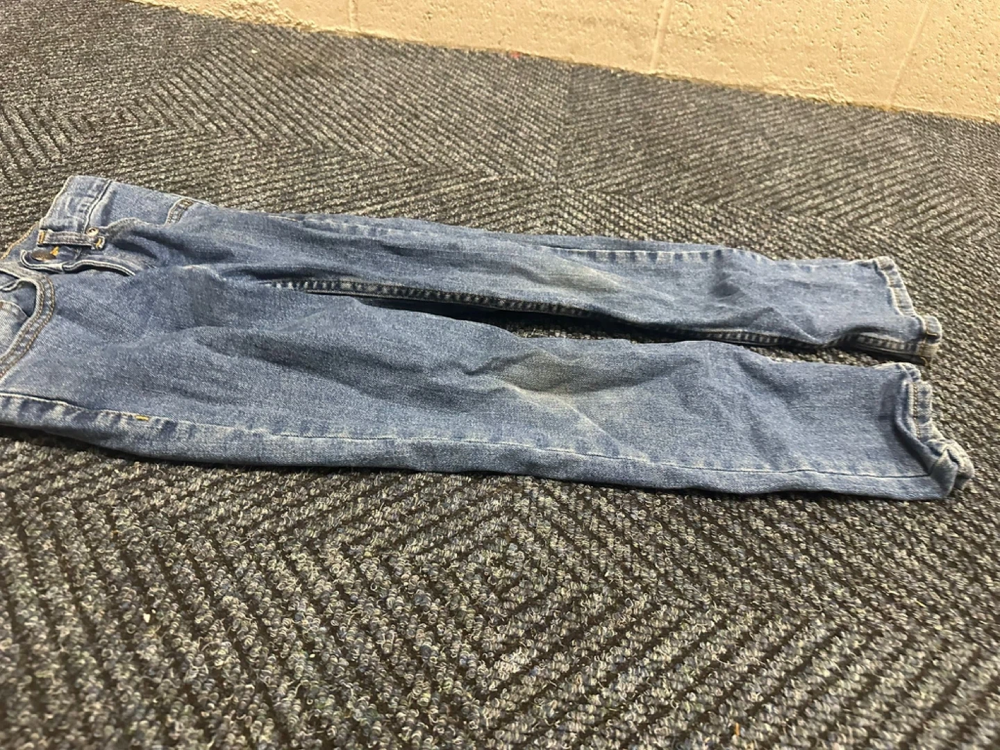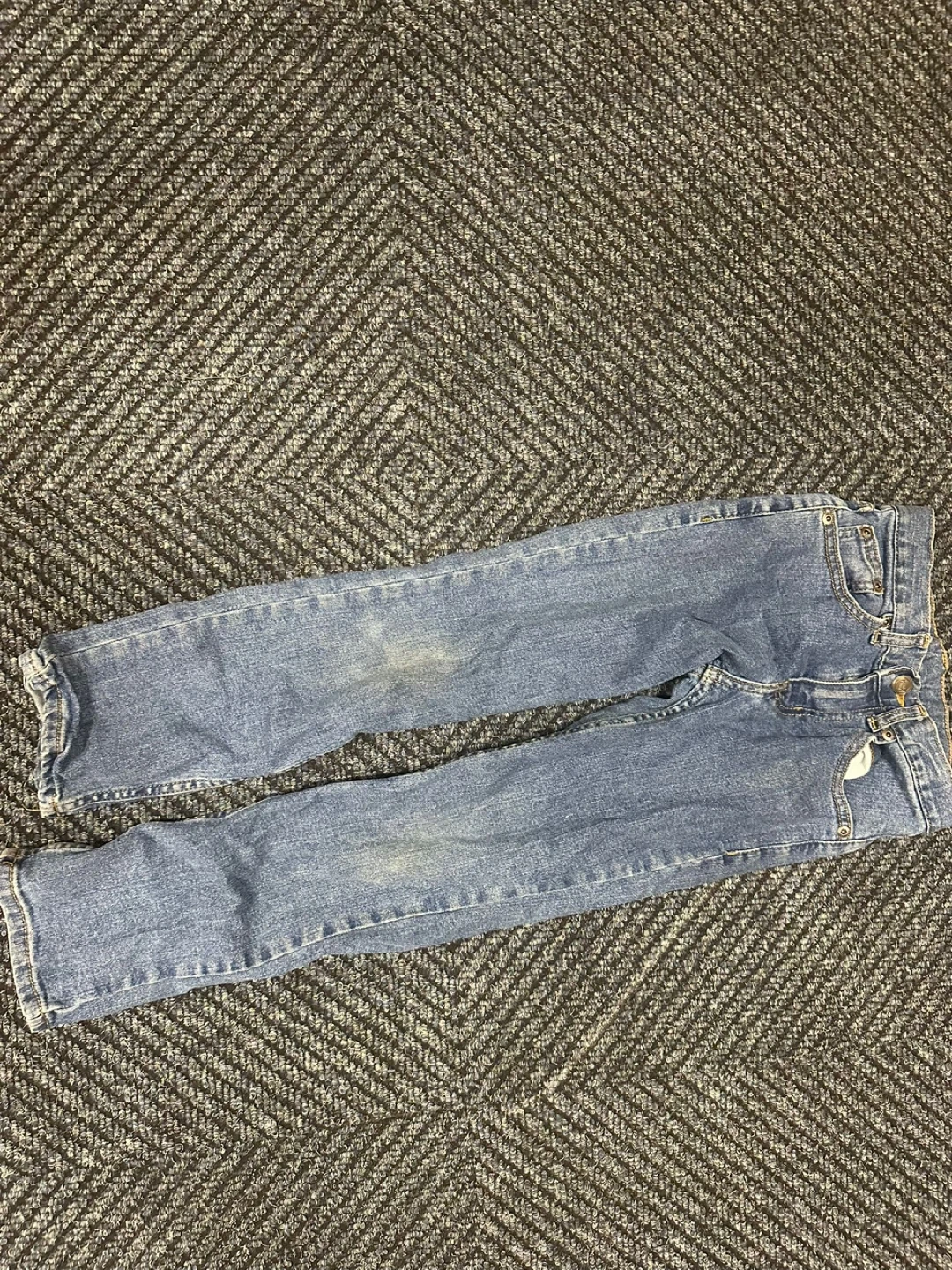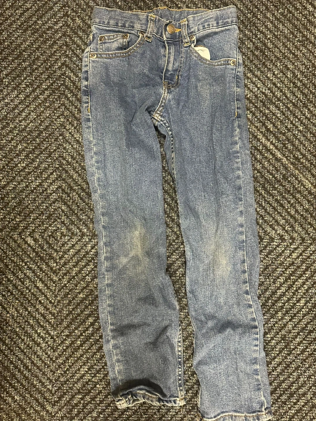 Selling a pair of gently used kids blue jeans. They are in good condition with some signs of wear.