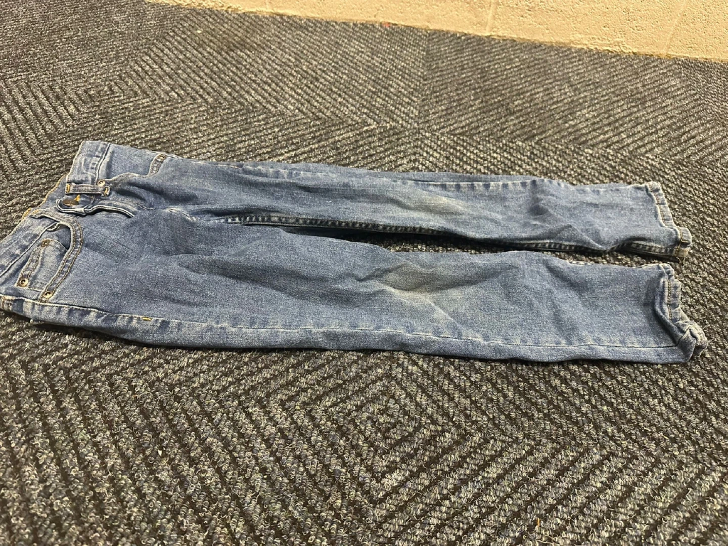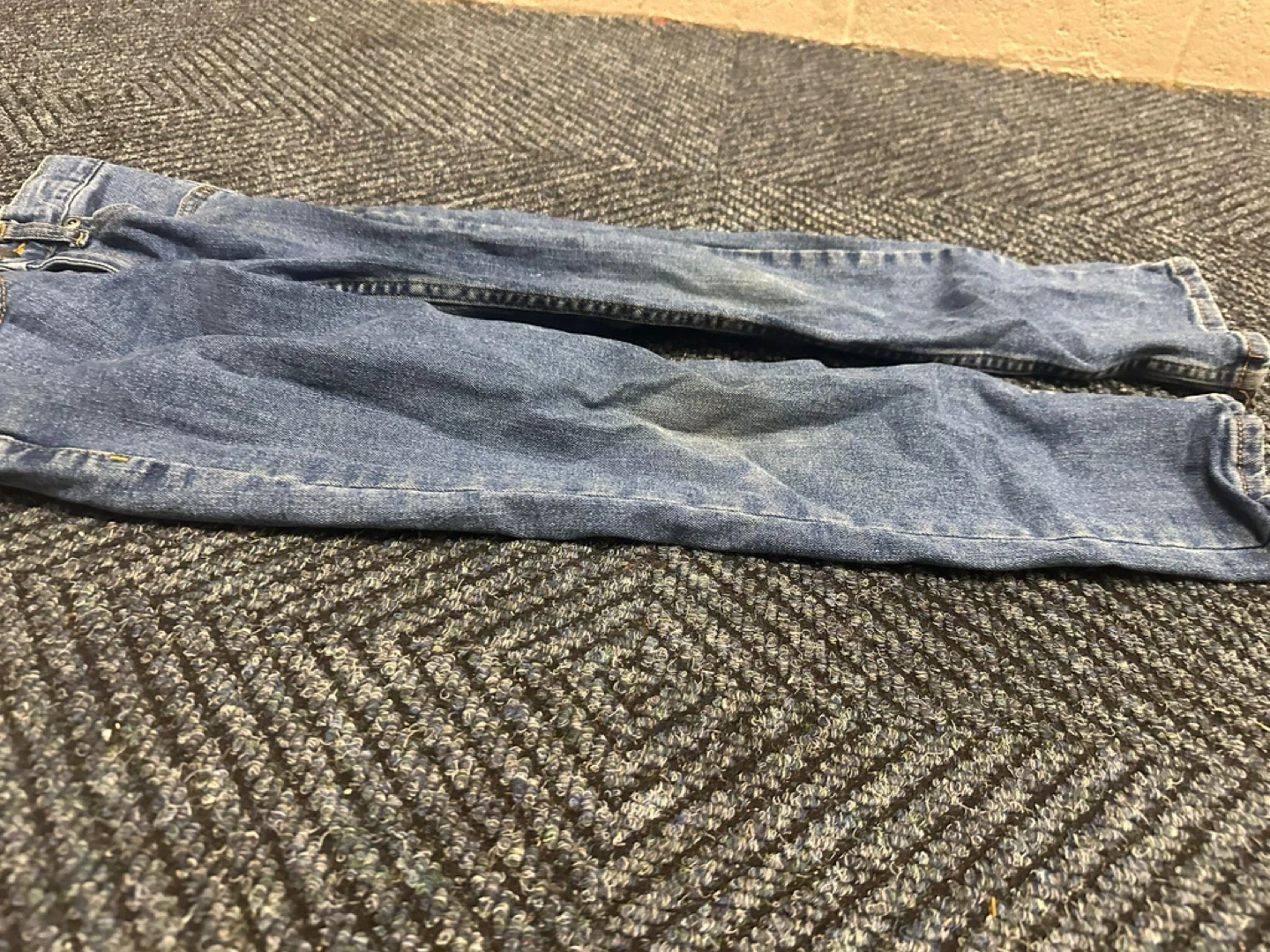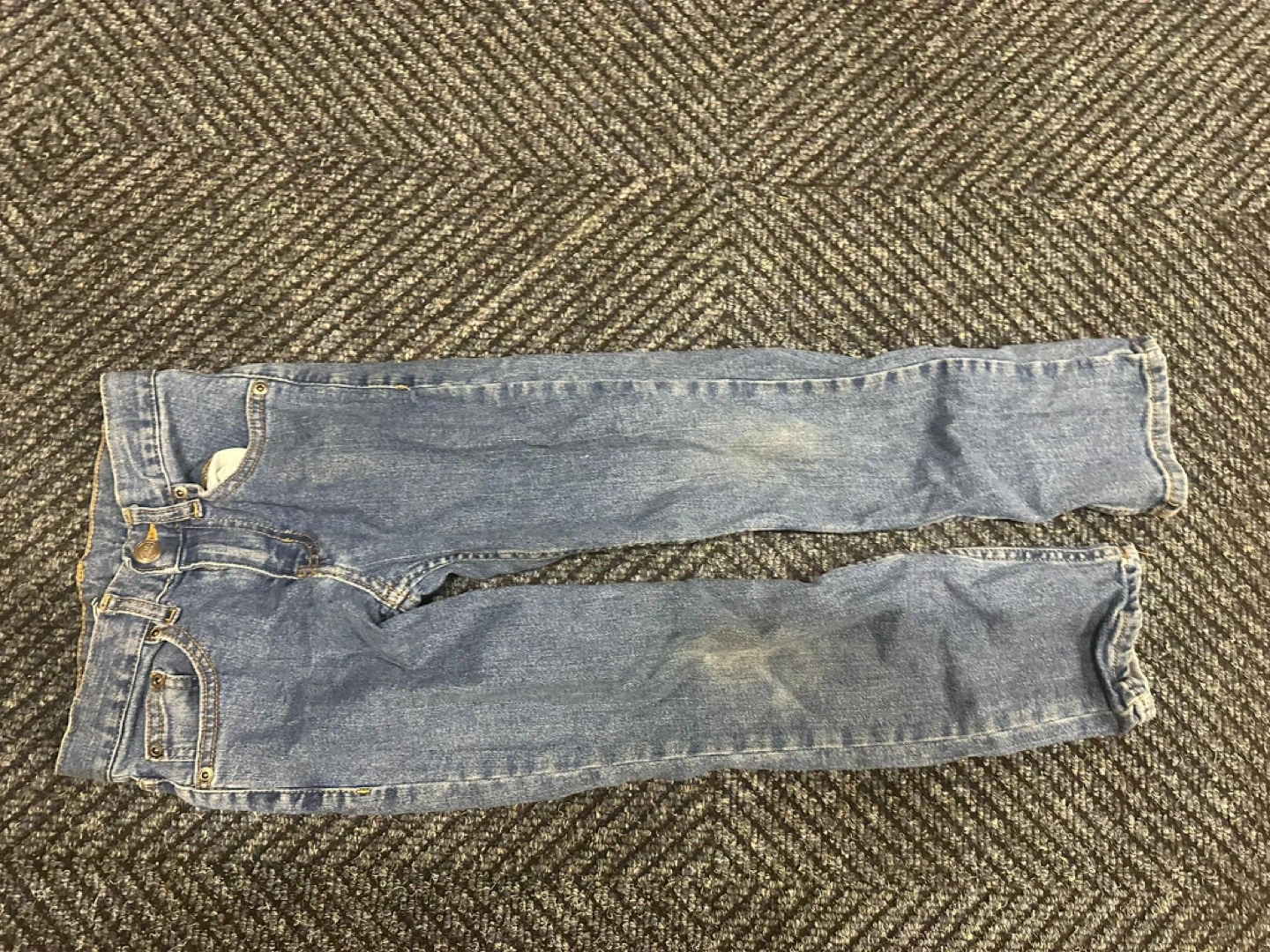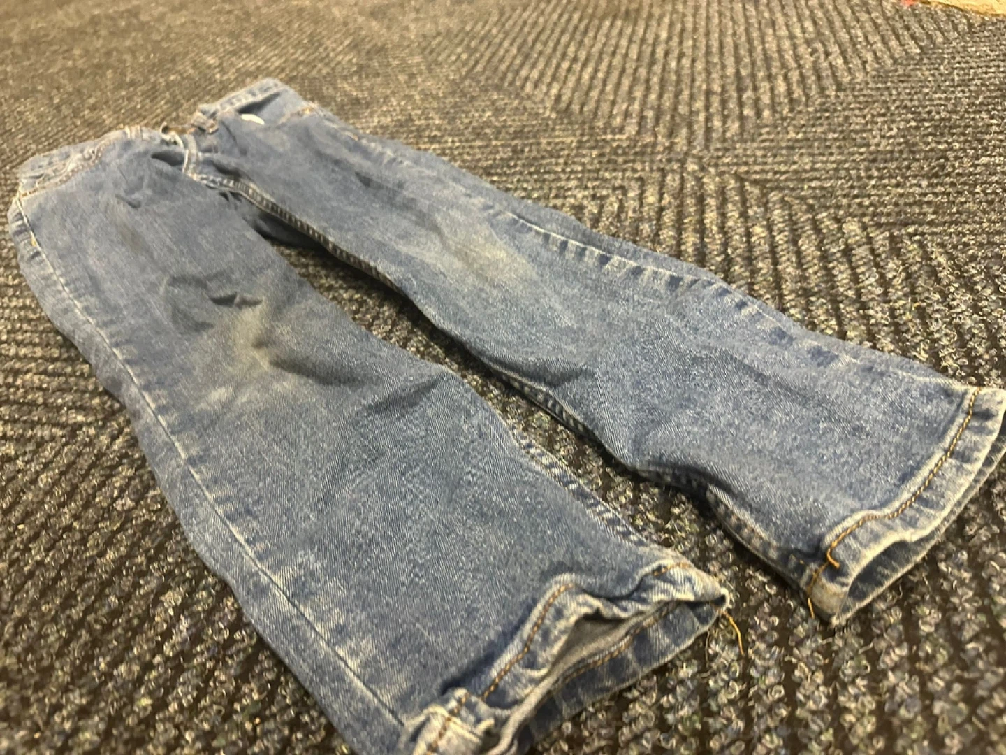 Selling a pair of gently used kids blue jeans. They are in good condition with some signs of wear.